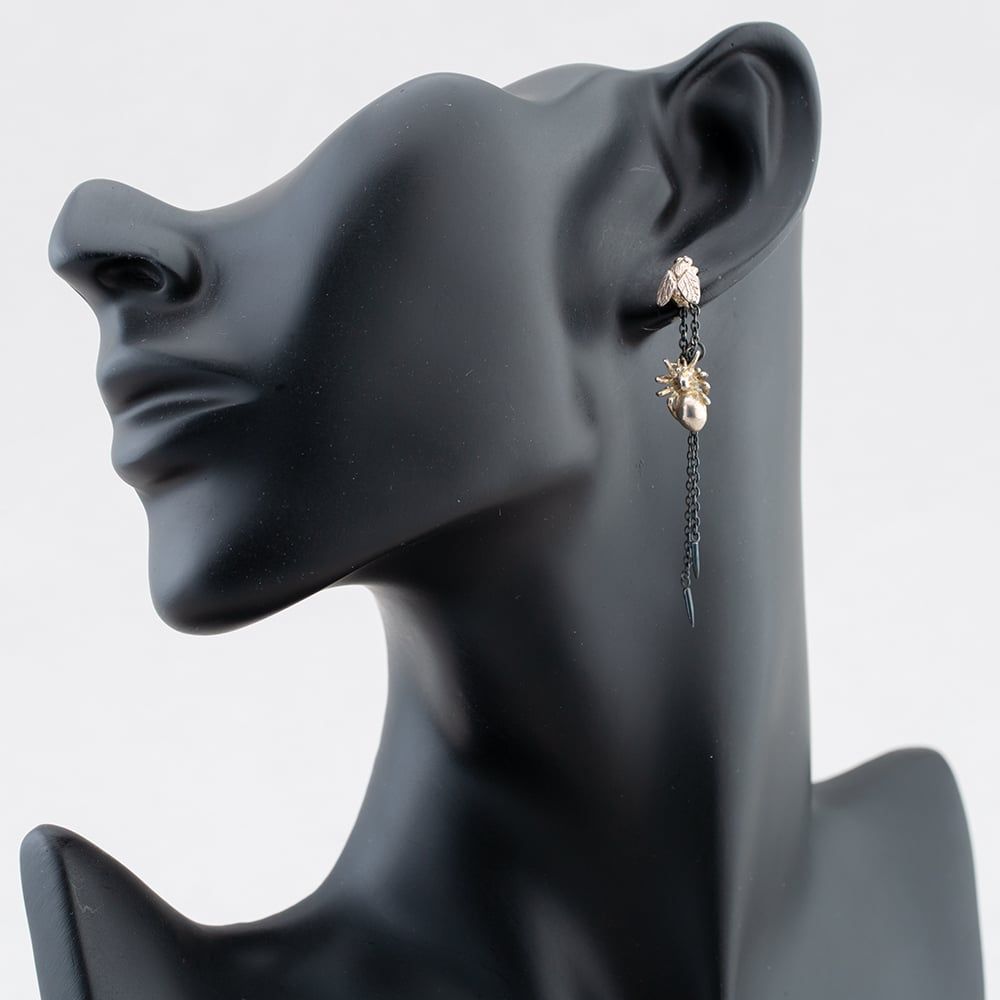 Edgy and captivating, these Oxidised Metal Spiderfly Chain Dropper Earrings feature a unique fusion of spider and fly motifs, creating a bold, gothic-inspired design. The dark, oxidised metal finish adds a moody, vintage feel, while the chain drops add movement and drama, making them a statement piece for those who embrace alternative style.