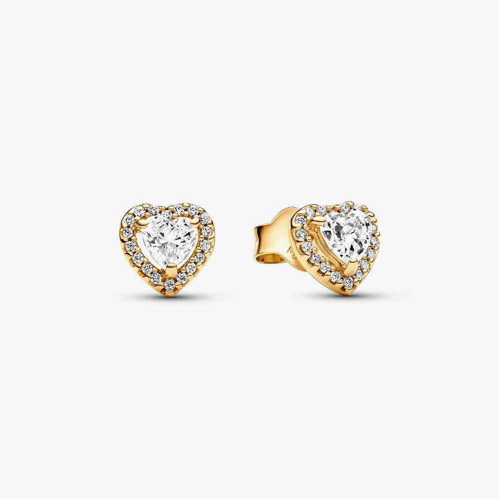 Add a touch of romance with the Pandora Sparkling Elevated Heart Stud Earrings in 14ct gold plating. Featuring a raised heart-shaped white cubic zirconia surrounded by a halo of sparkling round stones, these earrings offer delicate sparkle and timeless elegance. Perfect for everyday wear or gifting to someone special.