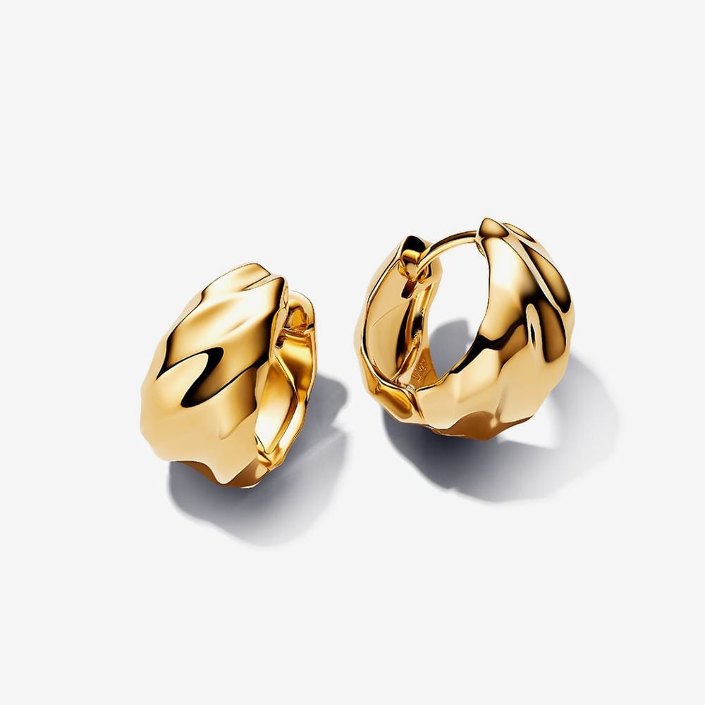 Elevate your everyday style with these 14ct gold-plated rippled hoop earrings by Pandora. Finished in a warm golden hue and crafted with a durable unique metal blend core, they feature a click closure for a secure, comfortable fit. A sophisticated staple designed to shine for years to come.