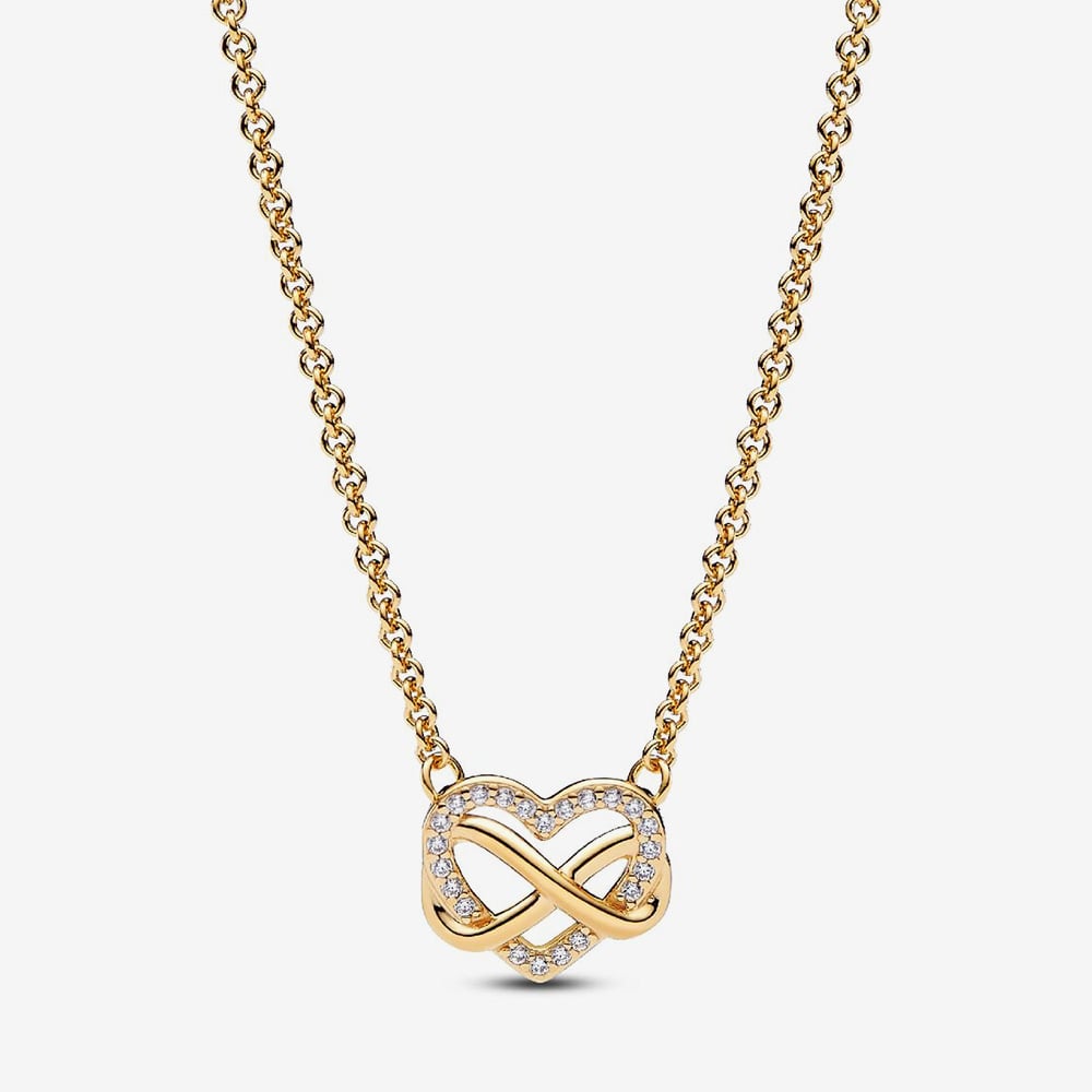Symbolising everlasting love, this 14ct gold-plated necklace by Pandora combines elegance with deep meaning. The openwork pendant blends a heart and infinity symbol, brought to life with 22 brilliant-cut cubic zirconia. Crafted to last with Pandora’s signature metal blend and warm golden tone, it’s the perfect piece to celebrate connections that never fade.