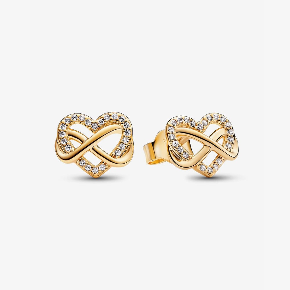 Celebrate timeless love with these elegant 14ct gold-plated stud earrings from Pandora. Featuring a delicate openwork design that intertwines a heart and the infinity symbol, they represent eternal connection and affection. Adorned with 44 bead-set cubic zirconia, each earring sparkles with graceful brilliance. Finished in a warm golden glow and crafted with Pandora’s unique metal blend core, they’re designed for lasting beauty and meaningful style.