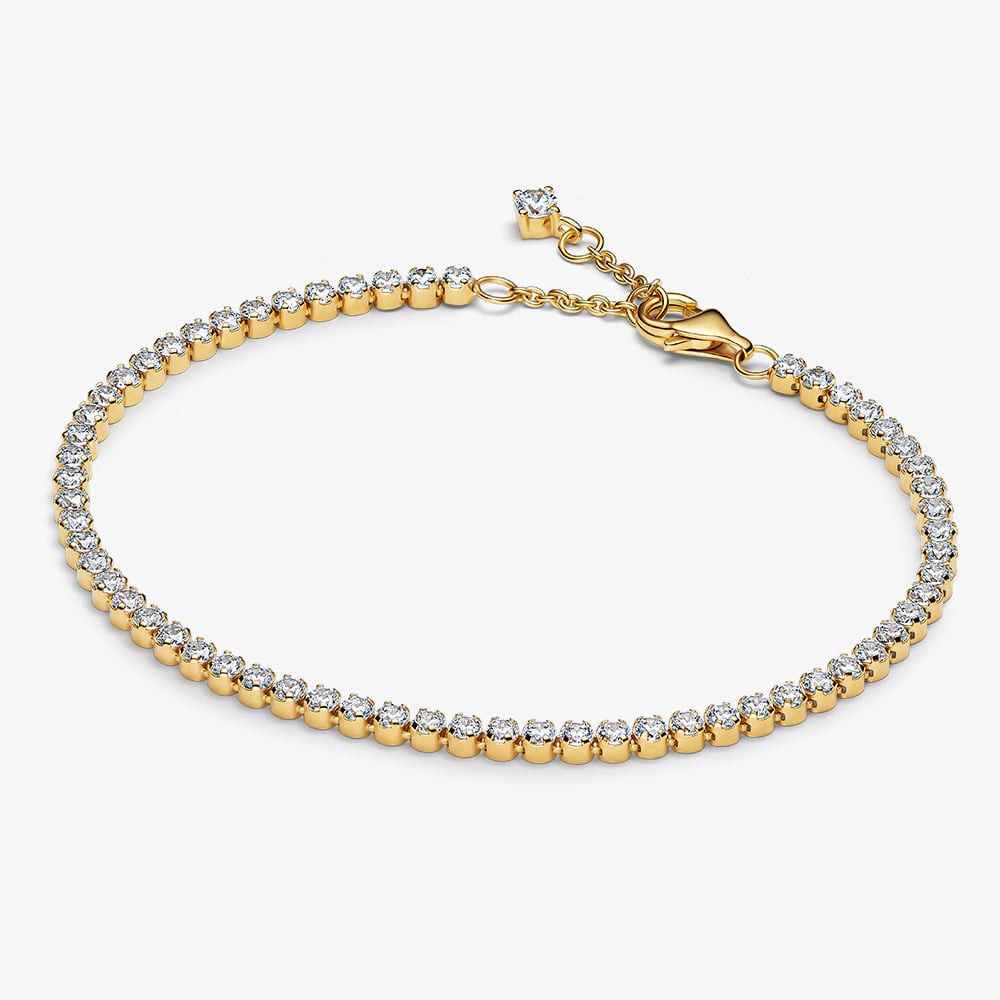 Timeless, elegant and an ideal gift for any occasion the Pandora tennis bracelet is crafted with 14ct gold plating to give a warm sunshine glow, set with an array of cubic zirconia that sparkle under the light. Complete with a lobster clasp to adjust to three wearable lengths, this bracelet is a jewellery box staple that can be treasured for years to come.