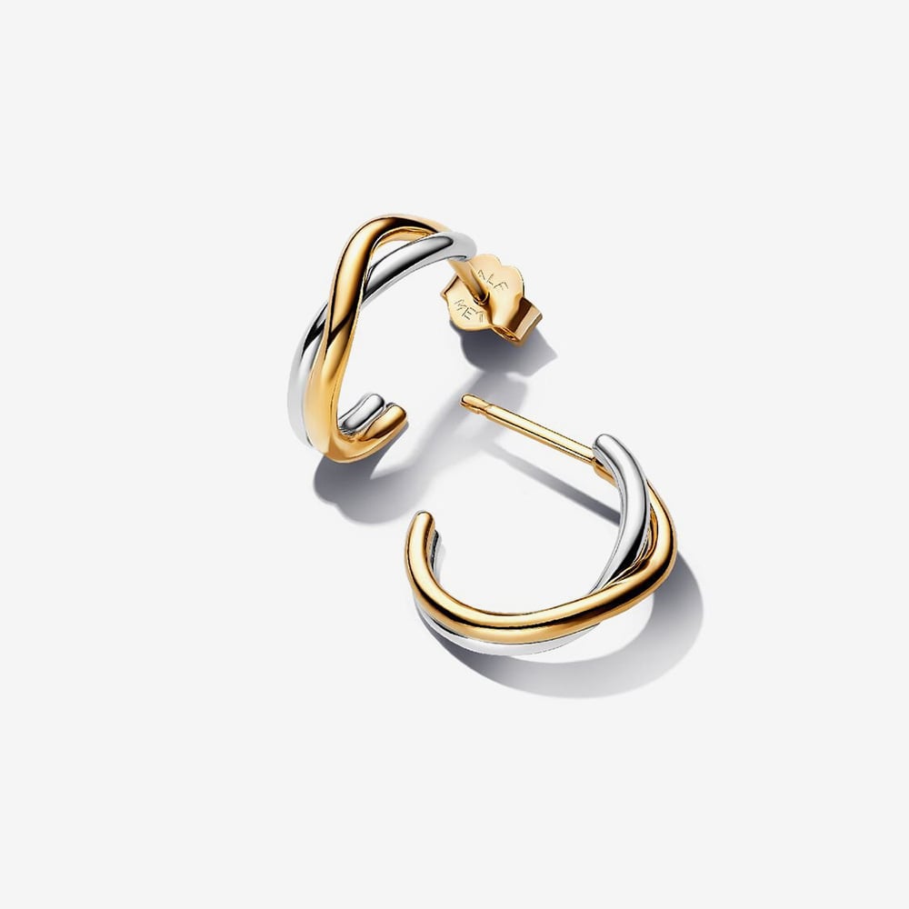 Embrace organic elegance with these uniquely shaped crossover hoop earrings from Pandora. Crafted in a mix of sterling silver and 14ct gold plating, their fluid, interwoven lines create a bold yet refined statement, perfect for adding a modern edge to any outfit.