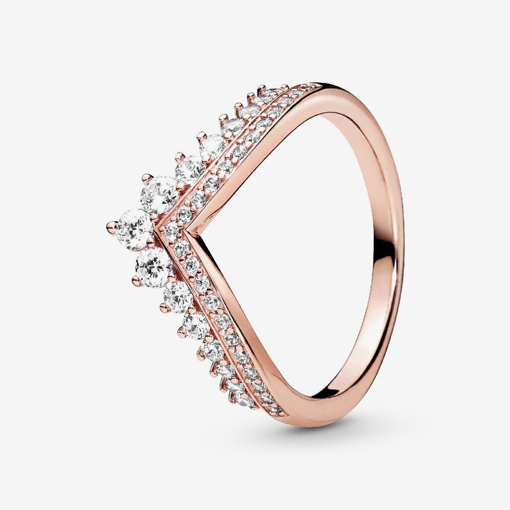 The beloved Pandora wishbone ring gets a regal update. Finished in 14ct rose gold plating, this sparkling ring takes on a princess-inspired look with layered cubic zirconia crystals along the band and set on its edge, creating a delicate tiara effect. Perfect for adding a touch of elegance and sparkle to any outfit.