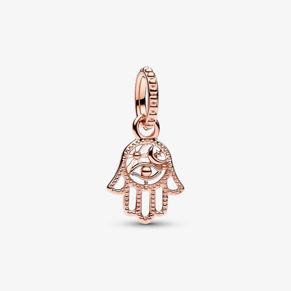 Embrace meaningful style with the Pandora 14ct Rose Gold-Plated Protective Hamsa Hand Dangle Charm. This beautifully detailed charm features the ancient Hamsa hand symbol, known for protection, luck, and positive energy. Crafted in a warm rose gold-plated finish, it’s accented with delicate cut-out detailing and subtle sparkle—perfect for adding a spiritual touch to your bracelet or necklace.