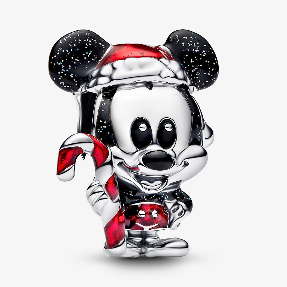 Celebrate the festive season with the Pandora Disney Mickey Mouse Holiday Charm in sterling silver. Hand-finished for high quality, Mickey holds a candy cane and wears a Santa hat, detailed with transparent red enamel, while his ears and body feature glittering black enamel for extra sparkle. A sweet Christmas gift for any Disney fan and a charming addition to your Pandora Moments bracelet.
