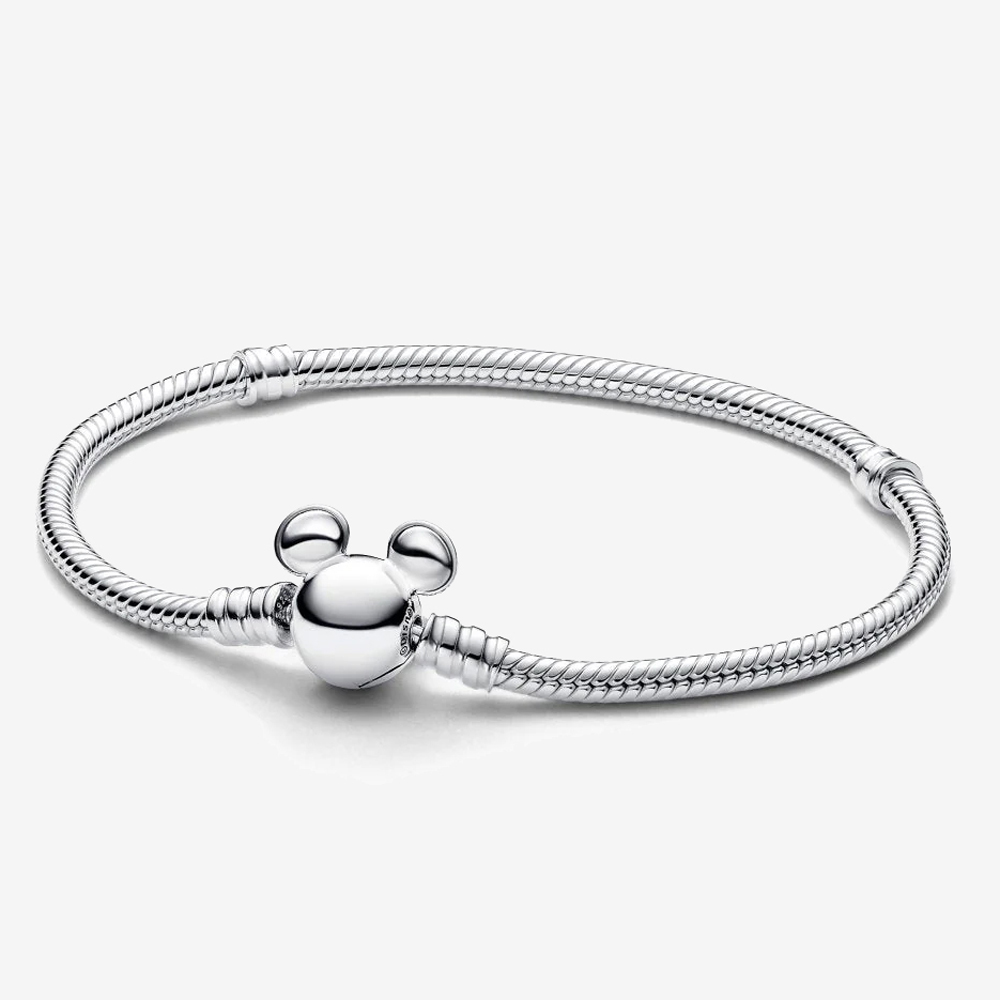 Celebrate the magic of Disney with this sterling silver snake chain bracelet from PANDORA Moments. The Mickey Mouse head-shaped clasp adds a playful touch, while two raised nodes hold clips in place to separate and organise your charms. Perfect for Disney fans, it’s a fun and stylish way to customise your bracelet with your favourite charms.