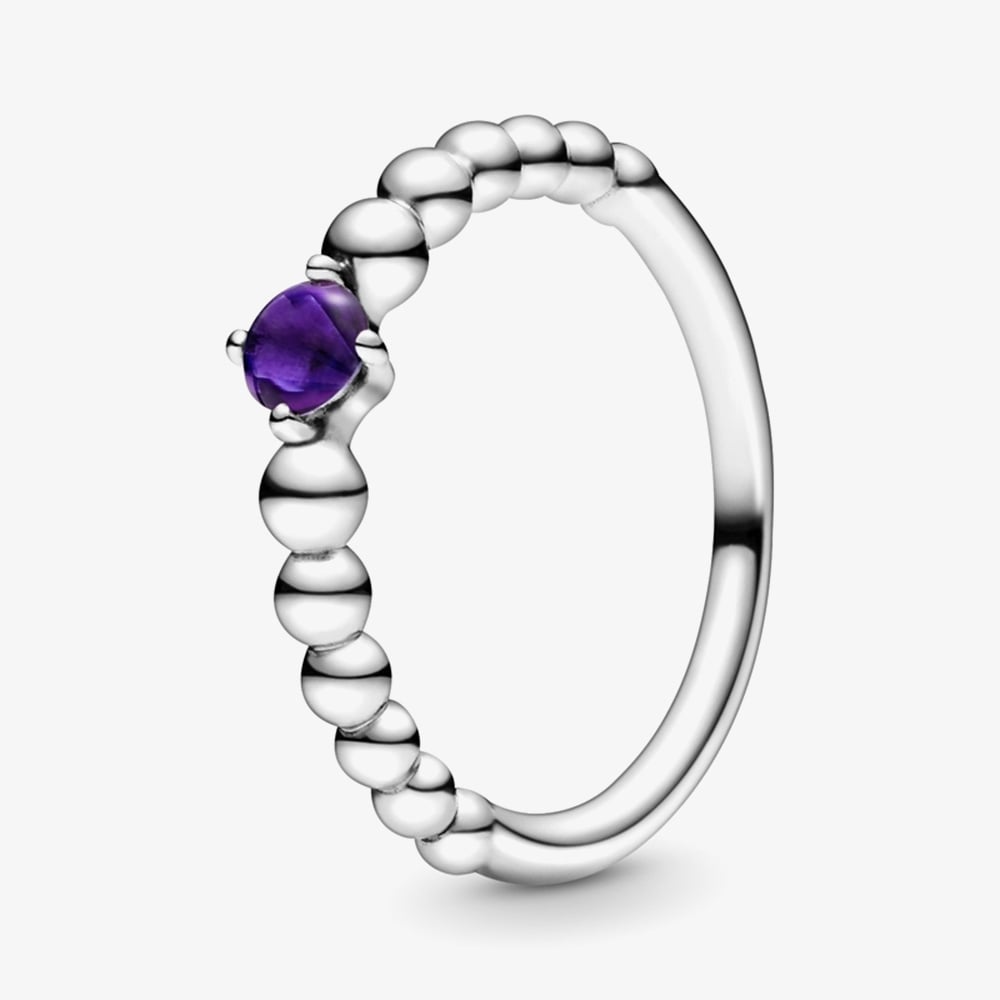 Celebrate February birthdays with the Pandora February Birthstone Beaded Ring in sterling silver. Featuring a green man-made crystal centre stone set on a delicate beaded band, this charming ring makes a thoughtful birthday gift or a sweet addition to any jewellery collection.
