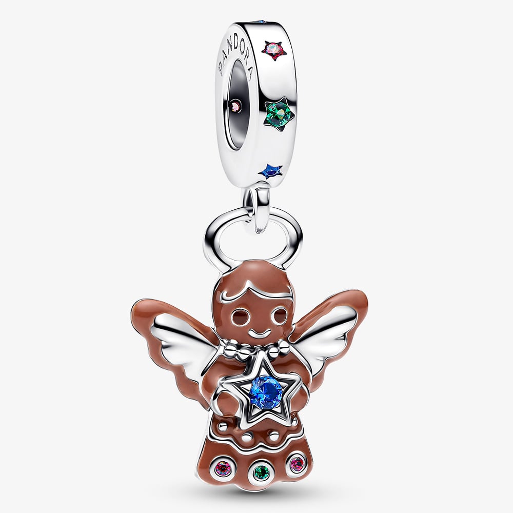 Celebrate the festive season with the Pandora Gingerbread Angel Dangle Charm in sterling silver for Pandora Moments bracelets. Expertly hand-finished for exceptional craftsmanship, the gingerbread angel features brown enamel with silver wings, holding a large star set with a blue man-made crystal, while red and green crystals adorn her dress and bale. Engraved with "my sweetheart" this sweet gingerbread makes a charming Christmas gift perfect for the holiday season.