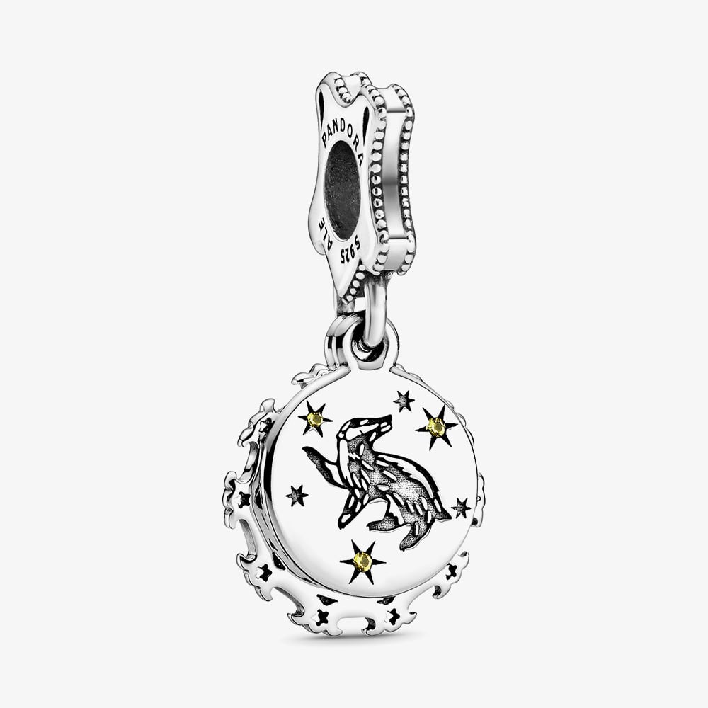 Show your Hufflepuff pride with the PANDORA x Harry Potter Hufflepuff Dangle Charm. Crafted in sterling silver, this double-dropper charm features a Hufflepuff-inspired disc with a badger emblem set with sparkling yellow man-made crystals, and a second disc engraved with “Patience Dedication Loyalty”, accented with cut-out stars. Perfect for fans and collectors, it’s a magical addition to your Pandora bracelet.