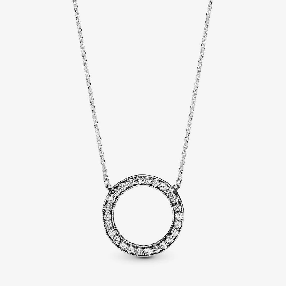 Add timeless elegance with the PANDORA Circle of Sparkle Necklace. Crafted in sterling silver and hand-finished, the open circle pendant features white cubic zirconia on one side and the Pandora logo on the other. Wear it multiple ways to create different looks – a perfect addition to your jewellery collection.