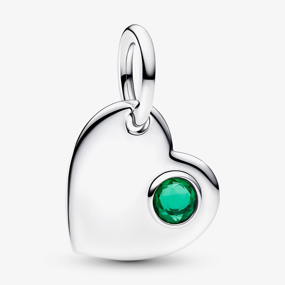 Celebrate birthdays with the Pandora May Birthstone Heart Dangle Charm in sterling silver for Pandora Moments bracelets. Meticulously hand-finished for exceptional craftsmanship, the heart is made from sterling silver and features a royal green man-made crystal in one corner, making it a sweet and thoughtful birthday gift.