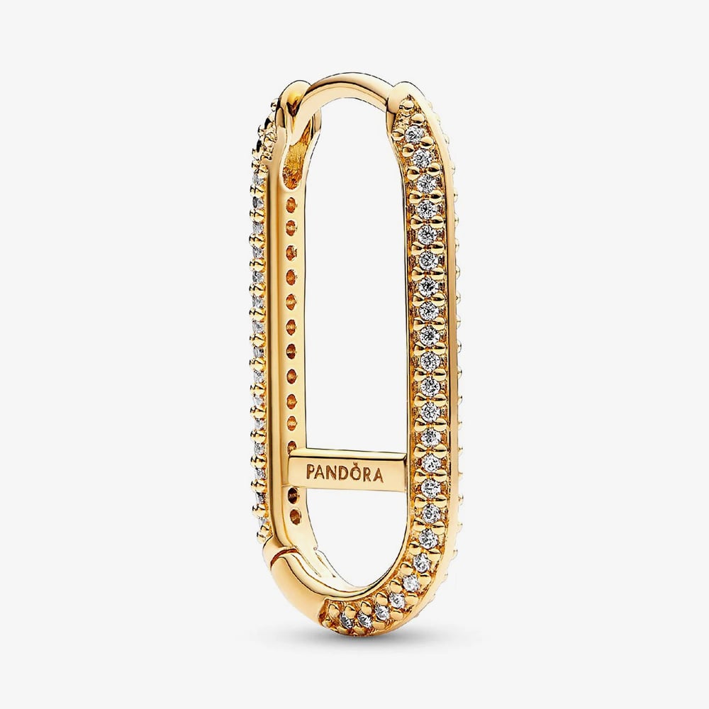 Add sparkle and style with the Pandora Extended Pavé Link Single Earring in 14ct gold plating. Featuring two rows of shimmering white cubic zirconia and a horizontal crossbar, this versatile earring lets you securely add charms or links to customise your look. Perfect for mixing, matching, and expressing your individuality.
