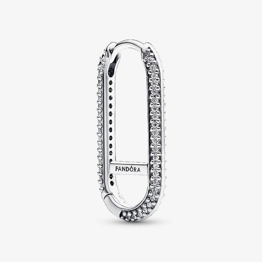 Make a statement with the Pandora ME Extended Pavé Link Single Earring. Crafted from sterling silver, this bold rectangular hoop features two rows of pavé stones for extra shine and a horizontal crossbar that allows you to securely add charms or links, giving you endless ways to customise and accessorise your look.