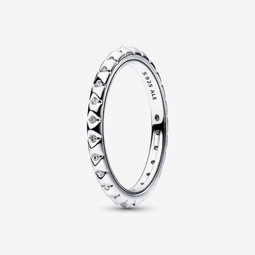 Channel ’90s cool with the Pandora ME Pyramids Ring. Crafted in sterling silver, this edgy yet elegant design features pyramid studs punctuated by sparkling clear cubic zirconia, with a subtle grooved line along the edges for added detail. Effortlessly versatile, it’s a statement piece that complements any look and invites you to create a fresh, customised style every day.