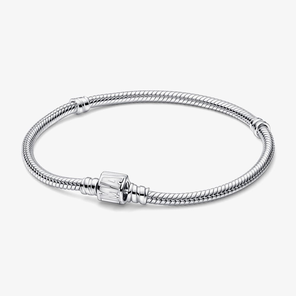 Celebrate your love for the Marvel universe with this sterling silver bracelet from PANDORA Moments. The logo-shaped clasp features Marvel written in white enamel, adding a bold and iconic touch. Perfect for styling with your favourite charms or wearing alone as a statement piece.
