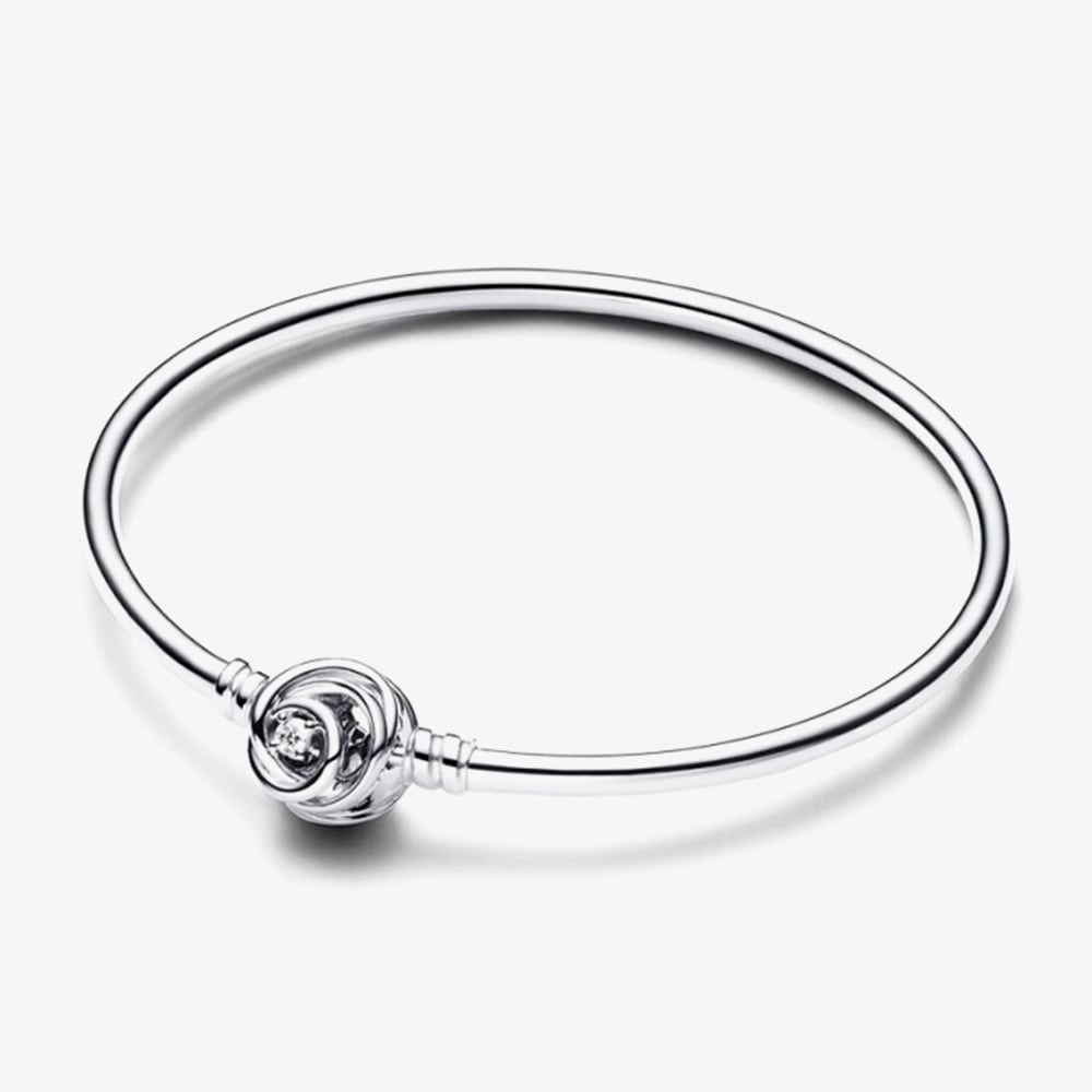 The PANDORA Moments Encircled Clasp Bangle is a stunning sterling silver bangle featuring an openwork swirl clasp set with a sparkling cubic zirconia. Perfect for customising with your favourite PANDORA charms, it’s a versatile piece that makes a thoughtful gift or a charming addition to your own jewellery collection.