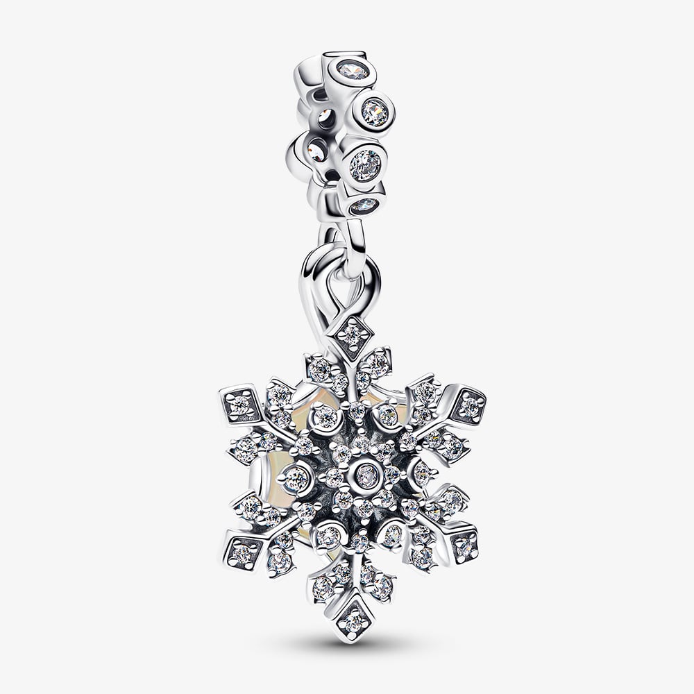 Embrace winter sparkle with the Pandora Opalescent Snowflake Double Dangle Charm in sterling silver. Featuring a snowflake set with white cubic zirconia and an opal resin star for extra shimmer, this charm adds a frosty elegance to any Pandora Moments bracelet. Finished with a cubic zirconia-set bale and "I melt for you" engraved on the back, it’s the perfect gift for a loved one to add seasonal shine to their look.
