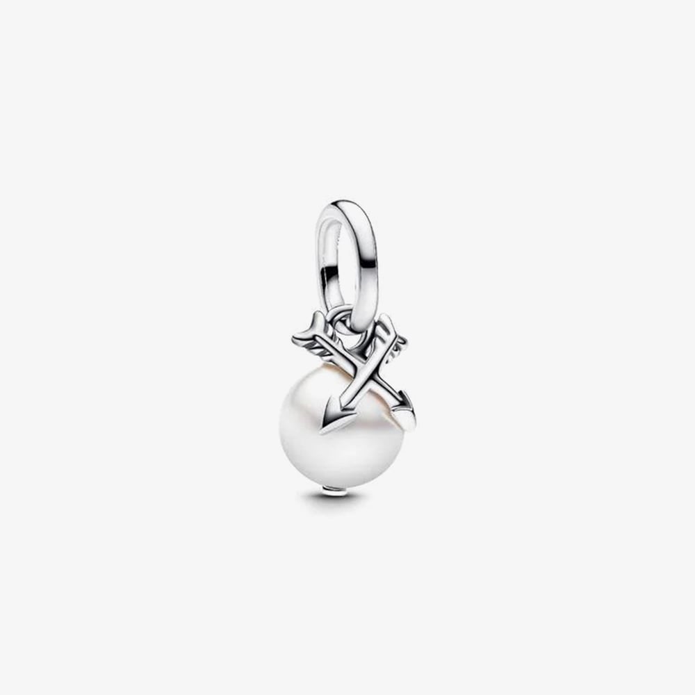 Aim for elegance with the Pandora Pearl & Arrows Mini Dangle Charm. Crafted in sterling silver, this delicate design features crossed silver arrows resting atop a lacquered artificial pearl, symbolising love, strength, and beauty, a perfect touch for any Pandora bracelet or necklace.