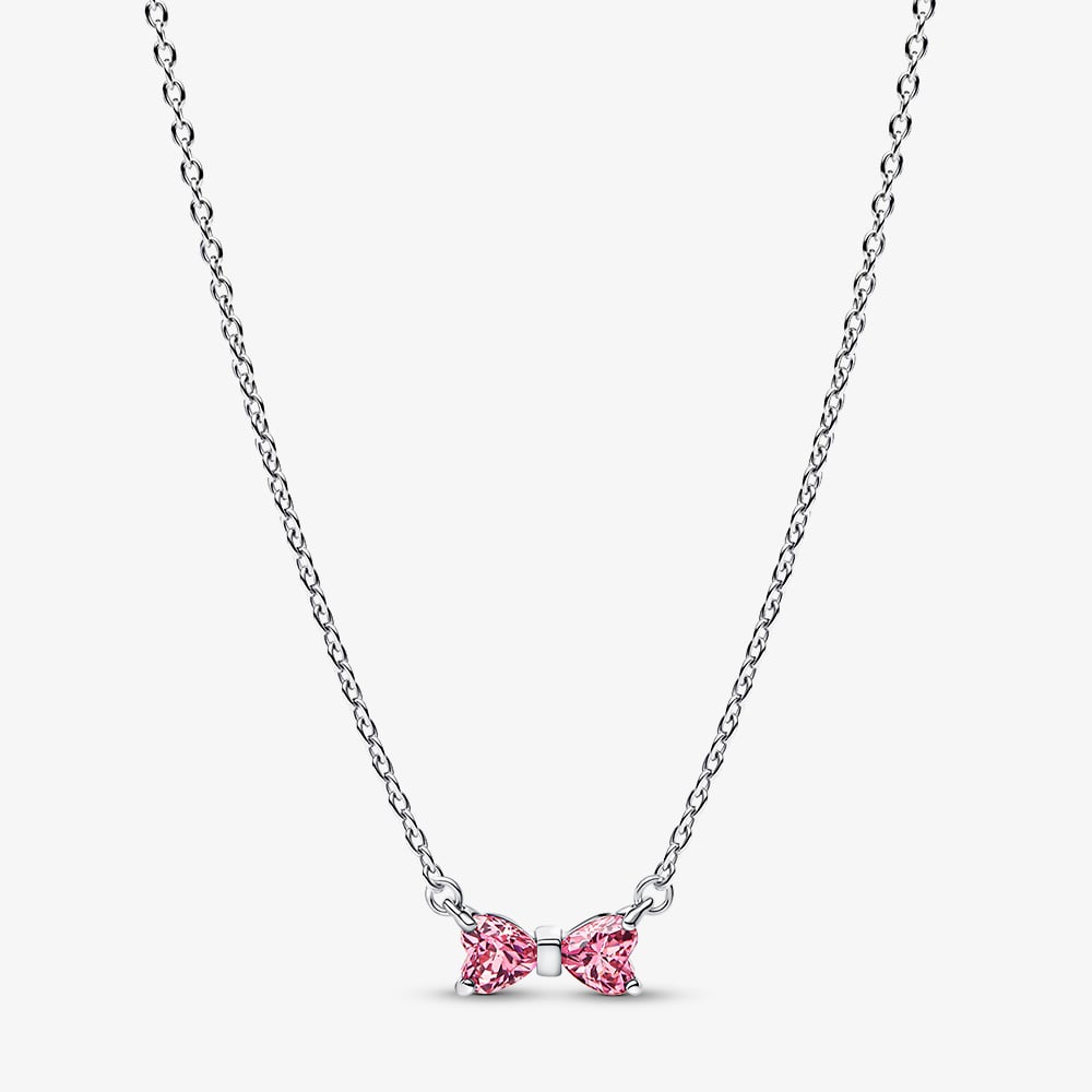Add a touch of charm with the Pandora Pink Cubic Zirconia Bow Necklace in sterling silver. Expertly hand-finished for lasting elegance, the bow pendant features two sparkling pink cubic zirconia hearts on a 45cm chain with lobster clasp. A sweet, versatile gift perfect for special occasions or everyday wear.