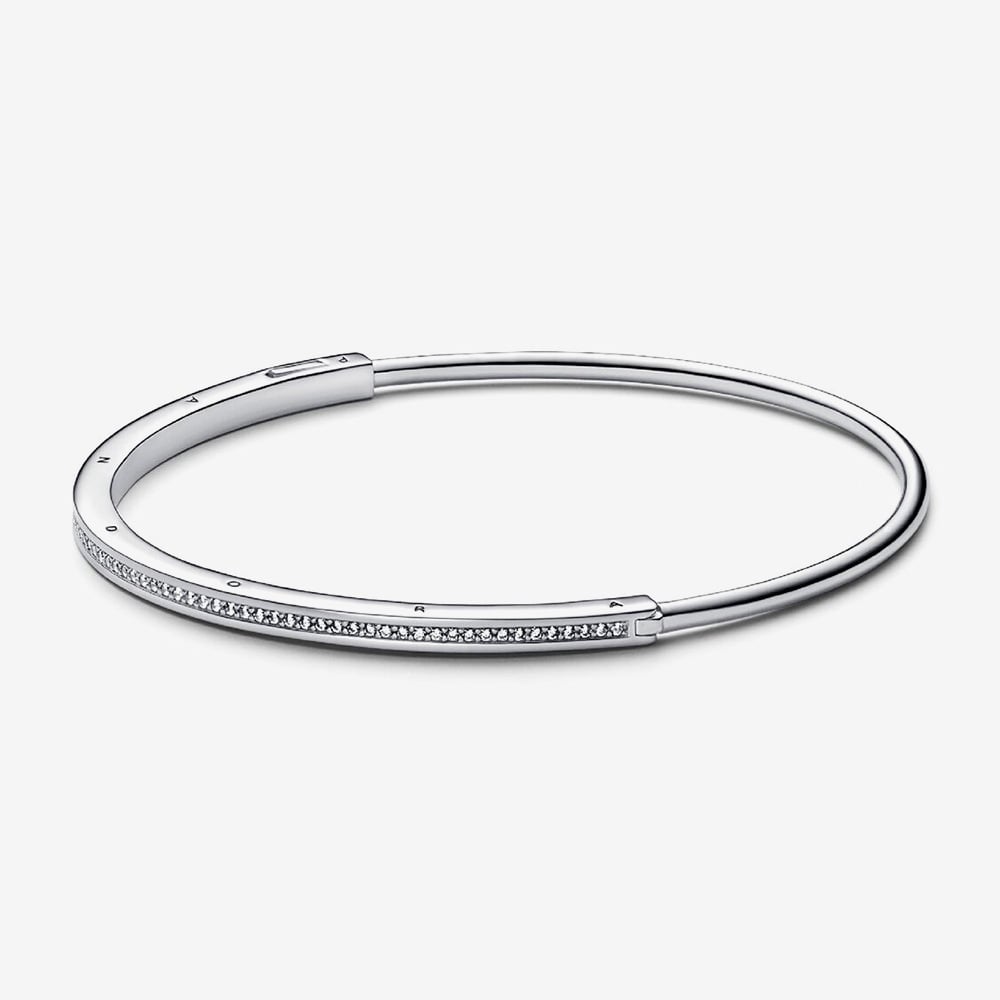 Elevate your style with the PANDORA Signature I-D Pavé Bangle. Crafted in sterling silver, this iconic design features an architectural square-and-round profile accented with a channel of pavé stones for subtle sparkle. Perfect for stacking with other PANDORA Signature I-D bangles, it allows you to create a personalised, iconic look.