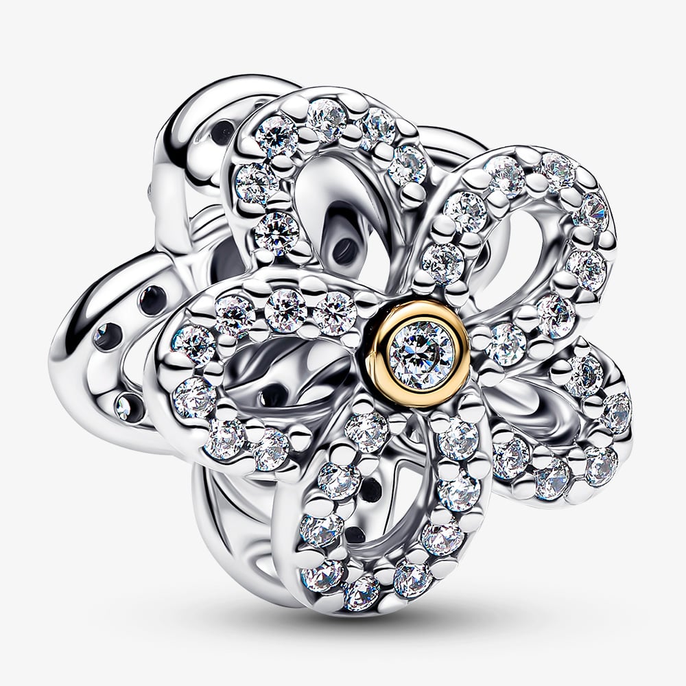 Intricately crafted in an openwork flower design, this Pandora Moments charm combines sterling silver and 14ct gold plating to give a complementing two tone design. Set with an array of shimmering cubic zirconia, this floral charm is perfect for adding a touch of spring to your bracelet. Add to your own collection or gift to a loved one.