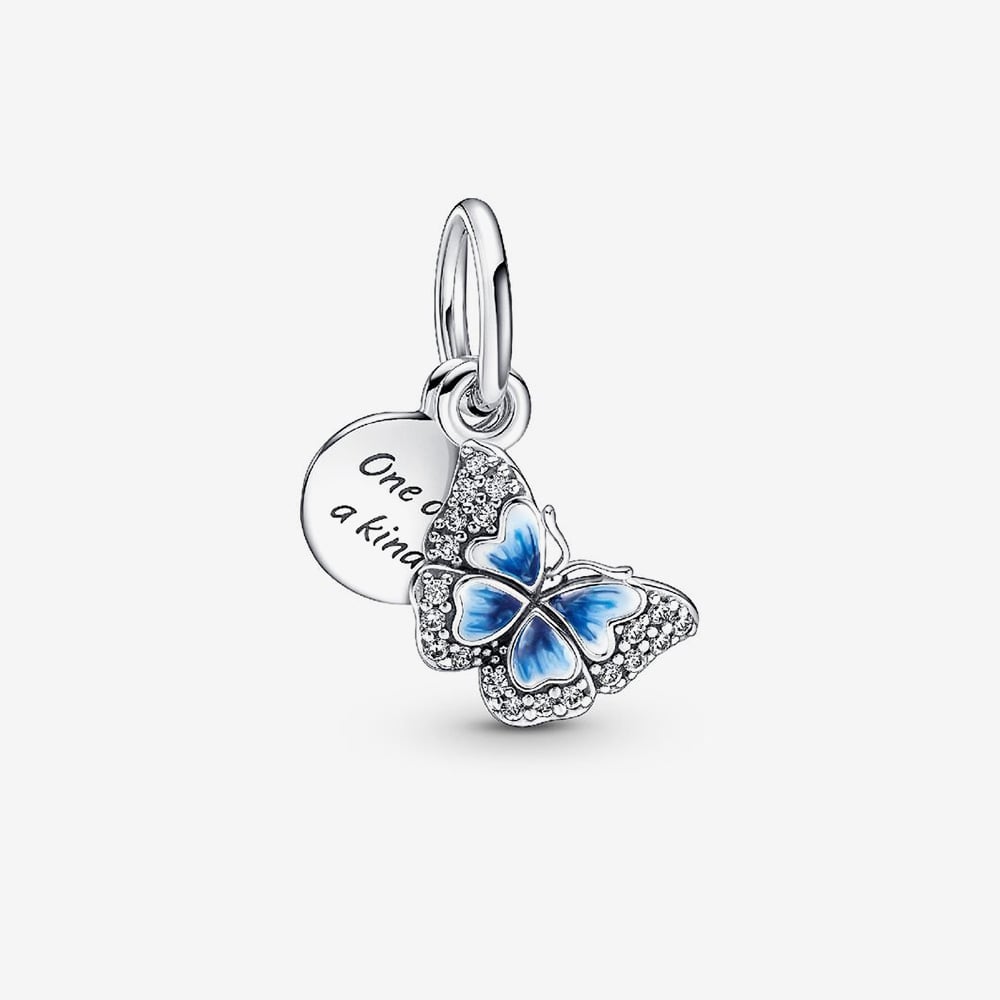 Embrace your true self with the One of a Kind Butterfly Dangle Charm. Vibrant blue enamel wings and shimmering cubic zirconia bring this butterfly to life, symbolizing transformation and growth. A sterling silver medallion engraved with “One of a kind” serves as a daily reminder to celebrate what makes you uniquely you, just like every butterfly in nature.