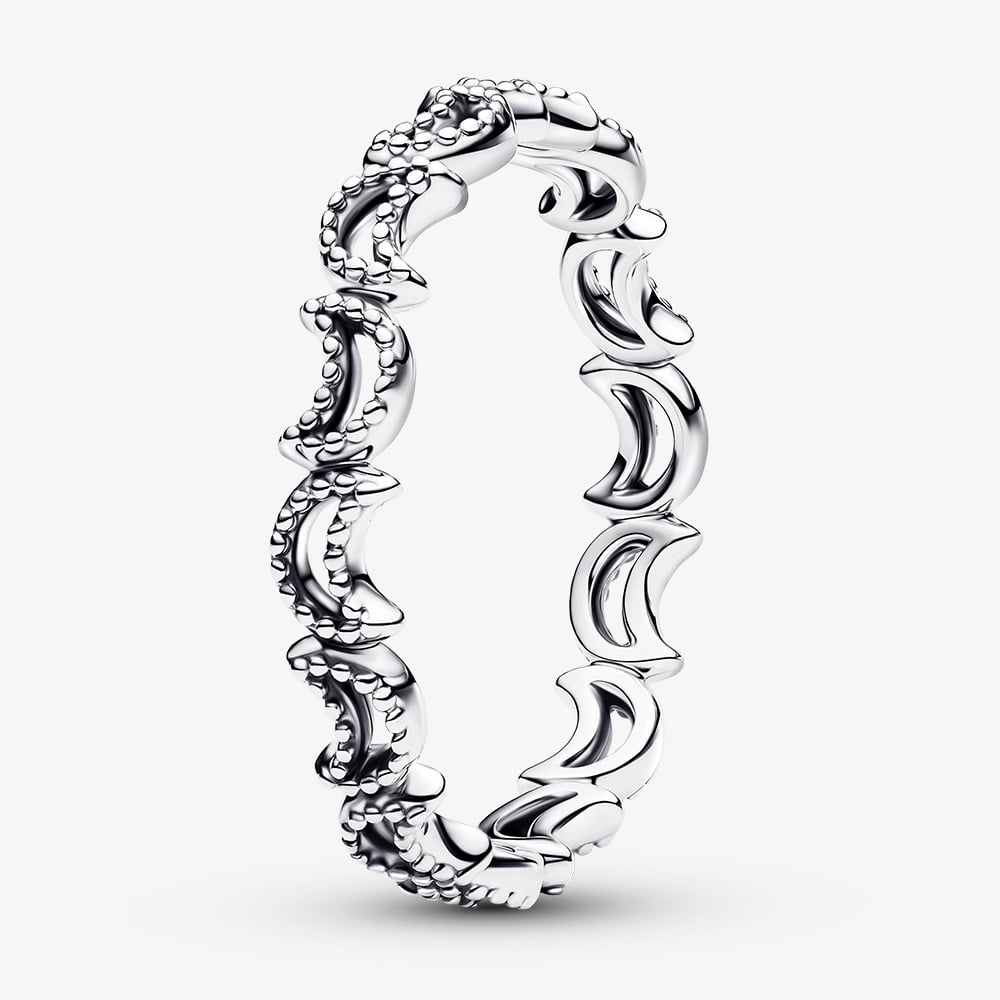 Add a celestial touch to your jewellery collection with the Pandora Silver Crescent Moon Ring in sterling silver. Expertly crafted with intricate microbeading, the openwork crescent moons form a celestial-inspired band. A must-have statement piece for any collection.