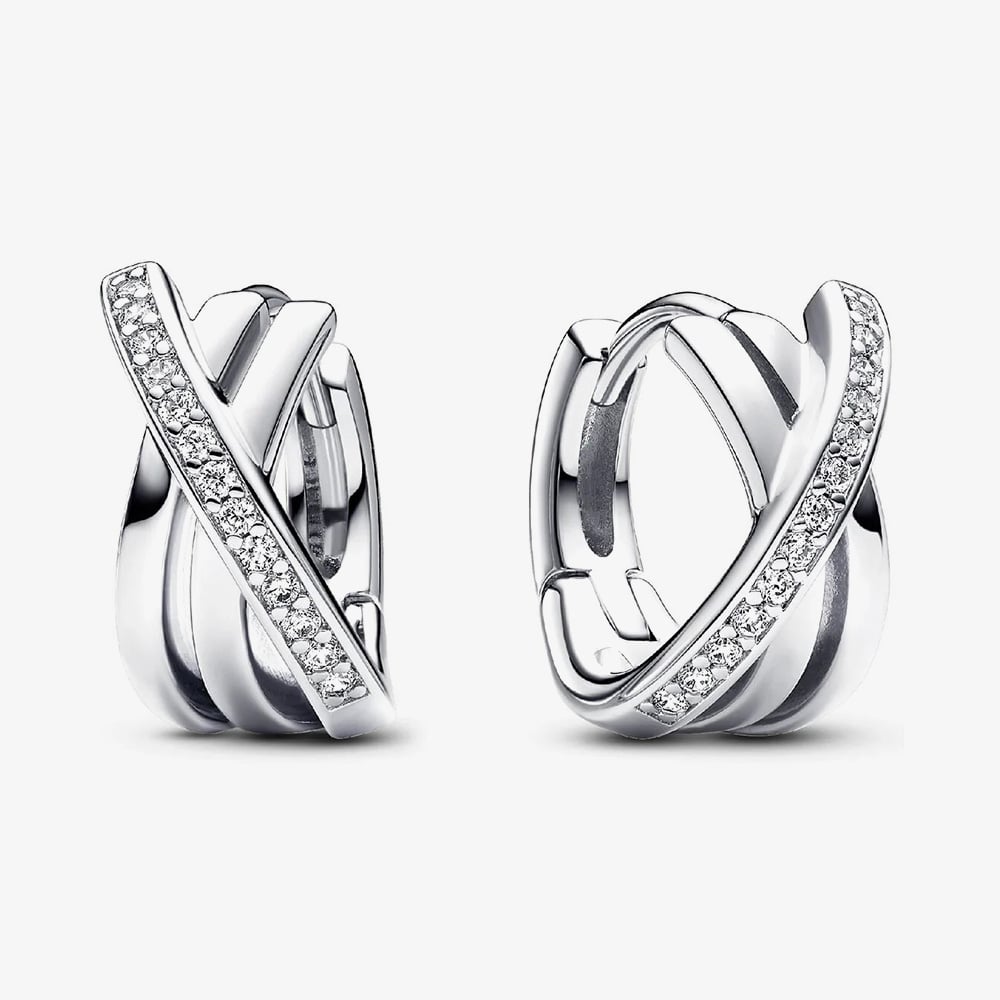 Channel modern elegance with the Pandora Pavé Crossover Hoop Earrings. Crafted from sterling silver, these chic hoops feature a squared crossover design adorned with sparkling pavé cubic zirconia, adding a delicate touch of glamour that’s perfect for any occasion.