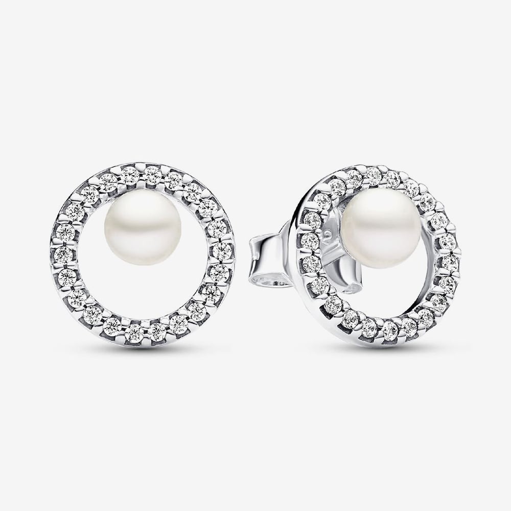 Graceful and contemporary, these sterling silver stud earrings by Pandora showcase a treated freshwater cultured pearl nestled within a glittering pavé circle. The off-centre design adds a modern twist, while the pearls embody beauty, wisdom, and love.
