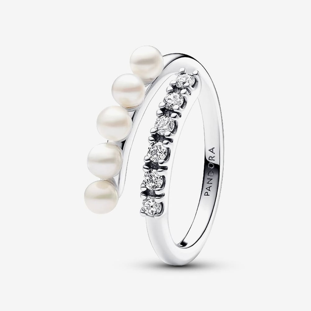 Elevate your style with the Pandora Treated Freshwater Cultured Pearl & Pavé Crossover Ring. Blending timeless elegance with contemporary design, this sterling silver ring features a row of lustrous treated freshwater cultured pearls on one end and sparkling pavé-set cubic zirconia on the other. Its open crossover style creates a chic, modern statement that’s perfect for any occasion.