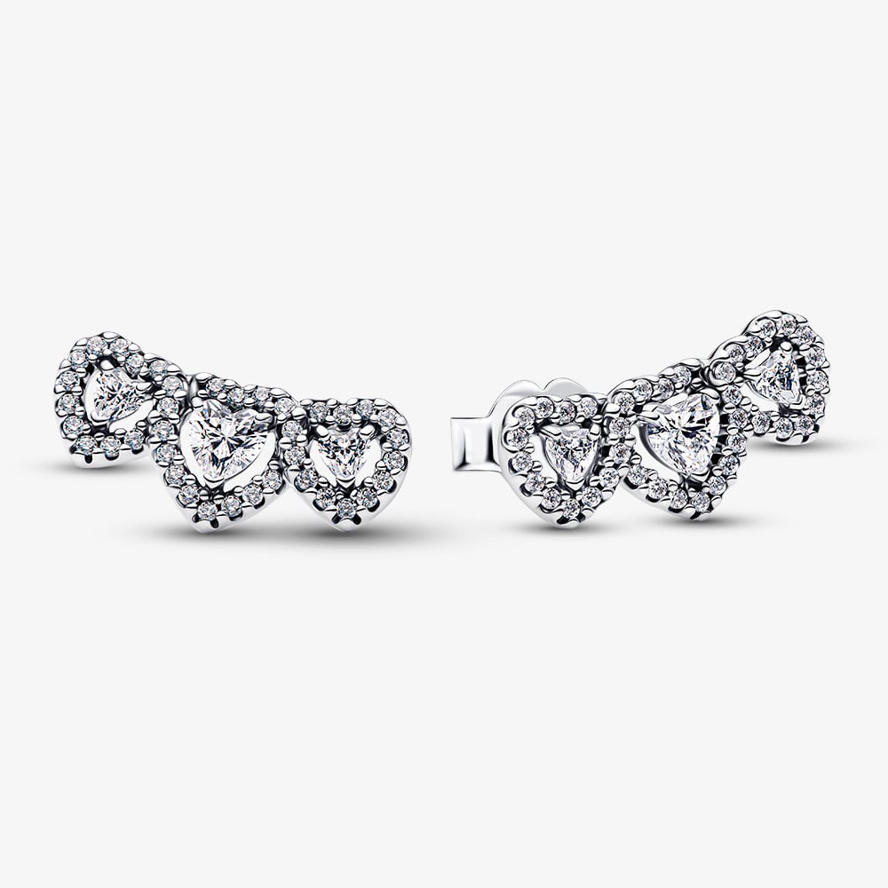 Celebrate love and sparkle with the PANDORA Silver Halo Heart Trilogy Stud Earrings. Crafted from sterling silver, these charming earrings feature three heart-shaped cubic zirconia stones, each surrounded by a halo of smaller stones for extra brilliance. Sweet and romantic, they make a perfect Valentine’s Day gift or a thoughtful present for a loved one.