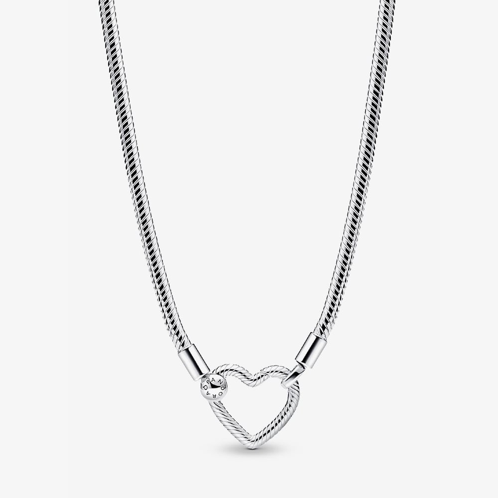 Celebrate what matters most with this meaningful Pandora necklace, crafted in sterling silver with our signature snake chain design. The heart-shaped clasp adds a romantic touch and can hold up to two dangle charms or pendants, spinning gently to bring subtle movement and charm to your look.