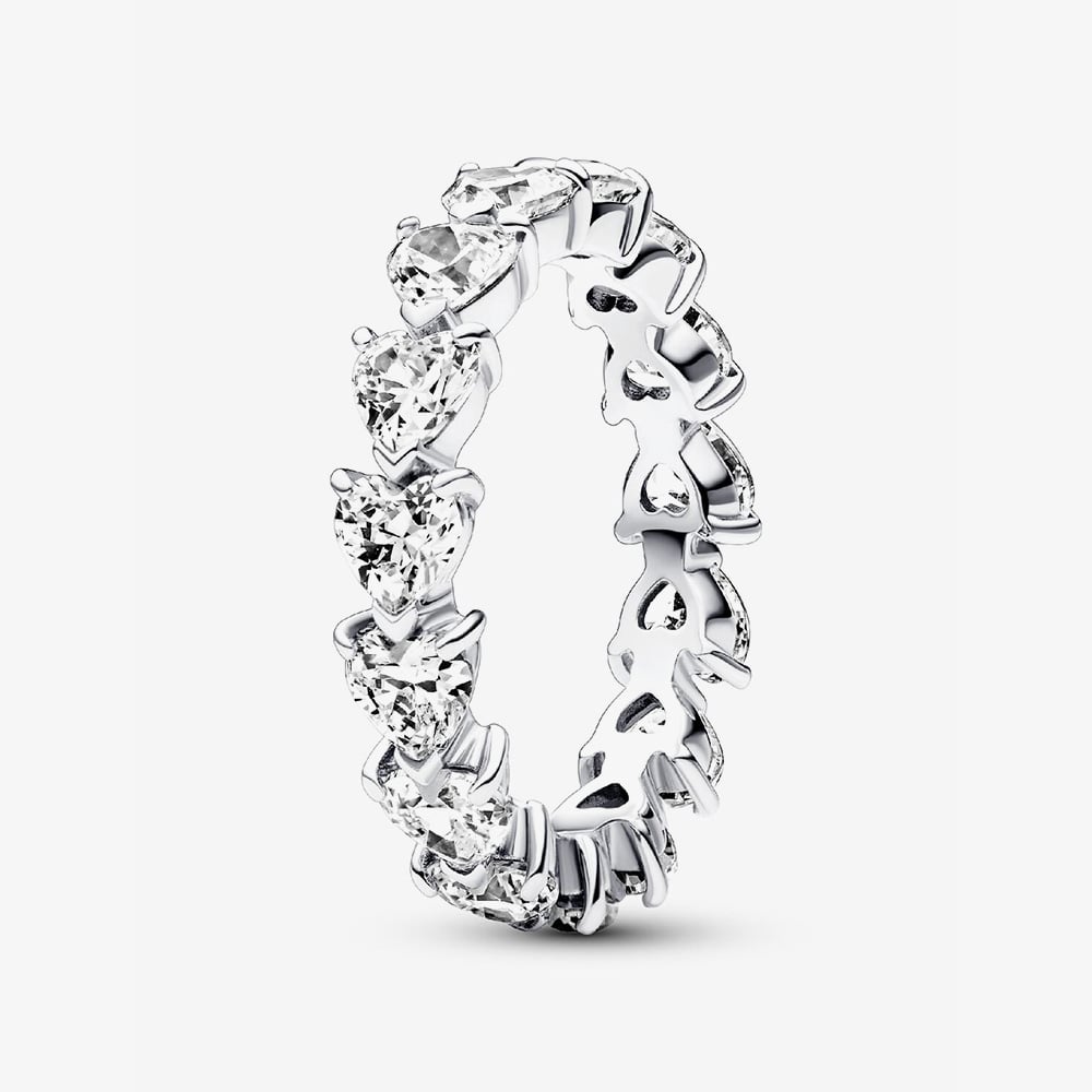 Celebrate endless love with this Pandora eternity ring, showcasing heart-shaped stones secured by V-shaped prongs in a contemporary design. Perfect for wearing solo or stacking with other rings to amplify the sparkle.