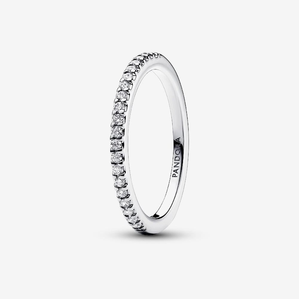 Add a subtle sparkle to your collection with this timeless Pandora sterling silver ring. Featuring a pavé row of clear cubic zirconia along the square-profile front, it’s the perfect piece to wear alone or stack for extra shine.