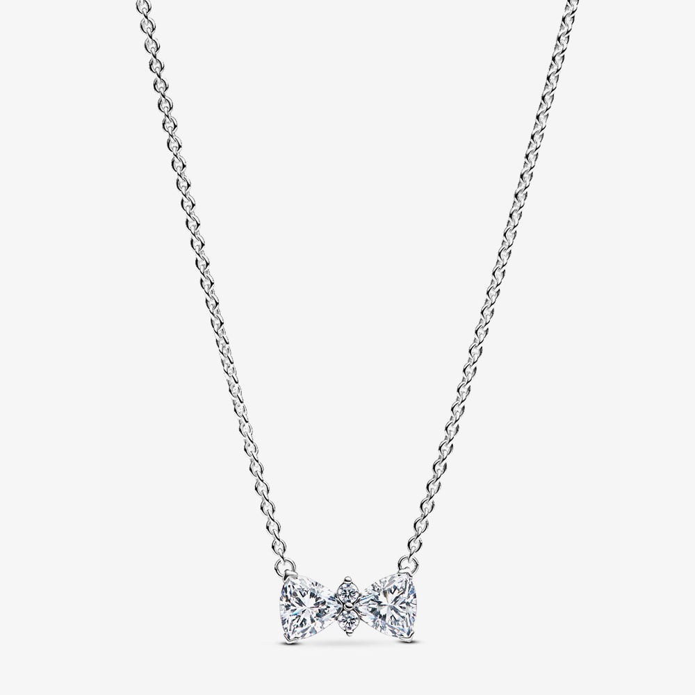 No look is complete without a bow, especially one that sparkles. This Pandora necklace in sterling silver features a delicate arrangement of cubic zirconia stones, specially cut and set to form an elegant bow motif. Perfect for adding a festive touch or gifting with love, it's a sparkling symbol of style and sentiment.