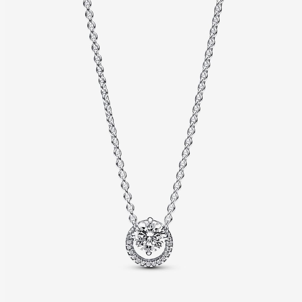 Embrace timeless elegance with this sterling silver pavé pendant necklace from Pandora. Featuring a sparkling cubic zirconia surrounded by a shimmering pavé halo, finished with a delicate stone charm at the clasp. Celebrating the beauty of circles, this sophisticated piece adds a refined touch to any look.