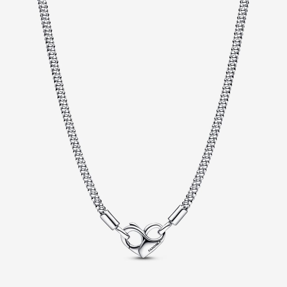 Refresh your collection with this hand-finished sterling silver studded chain necklace from Pandora. Featuring a sleek, textured flexible chain and a charming openable heart clasp detailed with the infinity symbol, it’s the perfect blend of modern style and meaningful design.