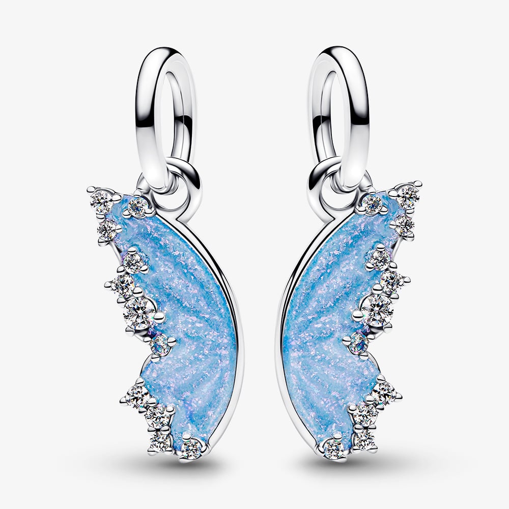 Celebrate friendship with the Pandora Splittable Butterfly Dangle Charm in sterling silver for Pandora Moments bracelets. Hand-finished for high quality, the charm splits into two dangles, each representing a butterfly wing. Light blue enamel with an iridescent shimmer and white cubic zirconia edges create a sparkling, delicate design. Engraved with "together above all", the butterfly dangle charm is a sweet gift for you and a friend.
