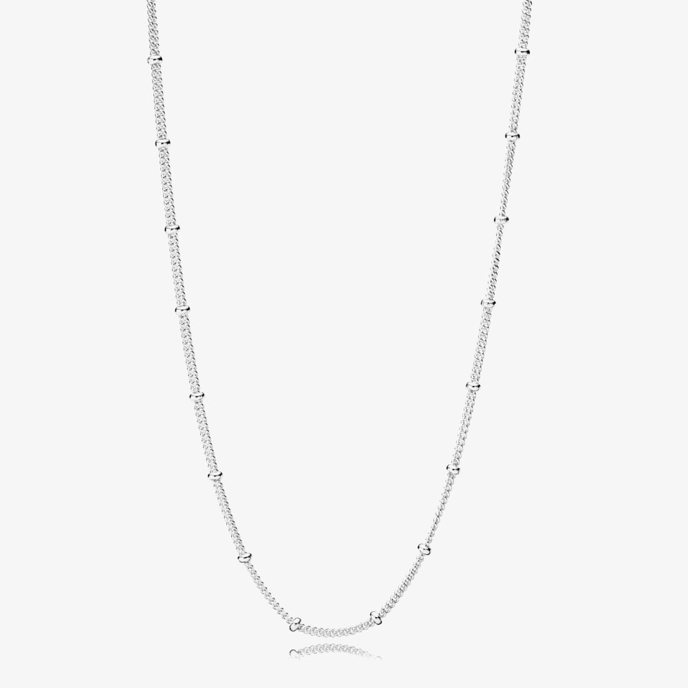 Add versatility to your jewellery collection with the PANDORA Sterling Silver Beaded Trace Chain Necklace. Crafted in sterling silver, this 70cm chain features delicate silver beads spaced along the length, making it perfect for layering with other necklaces or wearing alone for a subtle, elegant look.