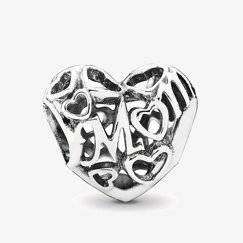 The Pandora Sterling Silver Openwork Mom Heart Charm is a beautifully crafted piece made from genuine sterling silver. Featuring an intricate openwork heart design, it elegantly spells out "Mom" in delicate script, making it a heartfelt tribute to maternal love. Perfect for adding a personal touch to any Pandora bracelet, this charm is a timeless gift that celebrates the bond between mother and child.