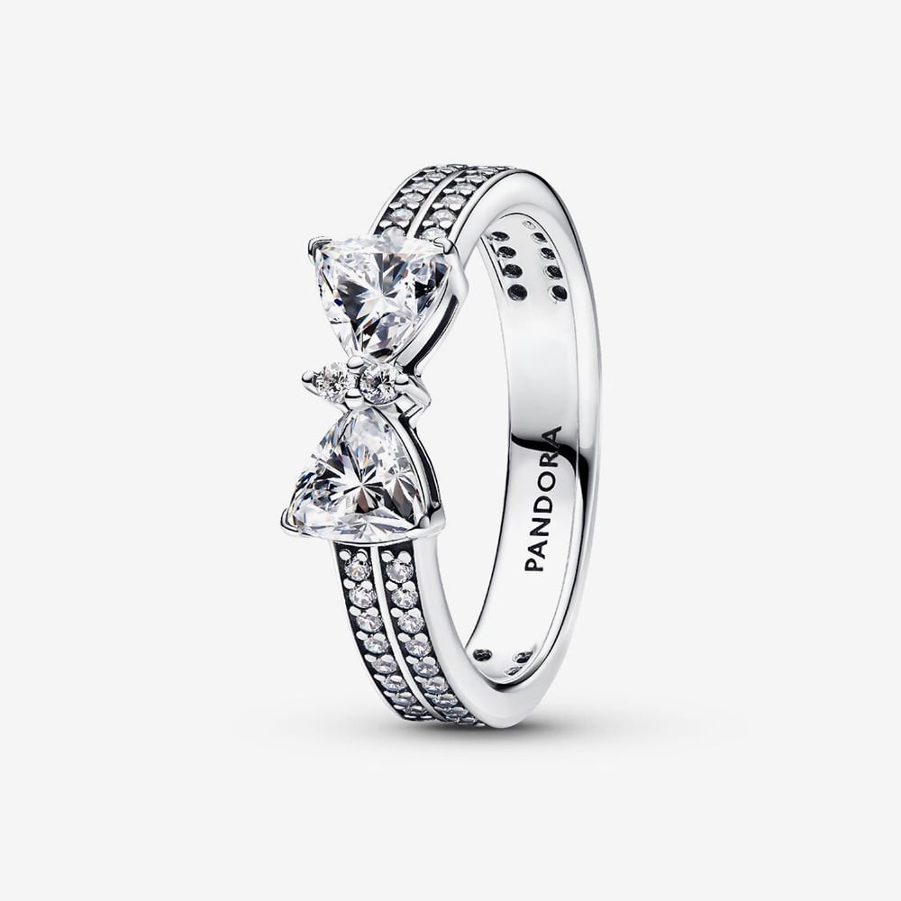 Add a sparkling statement to your look with the Pandora Sparkling Bow Double Row Ring. Featuring a contemporary bow motif framed with cubic zirconia and accented by a double row of pavé stones, this sterling silver ring brings shine and elegance to any outfit. Perfect for special occasions or everyday glamour.