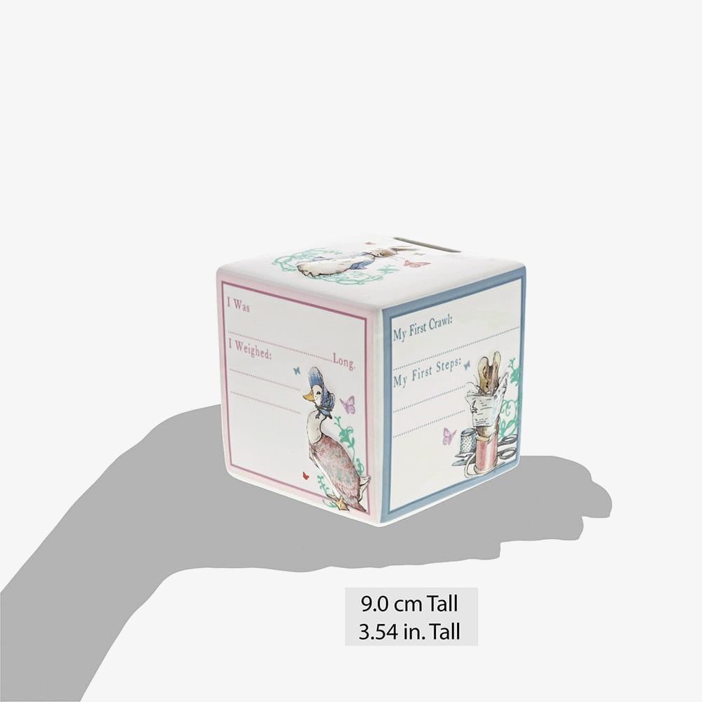 Celebrate a precious new arrival with the Peter Rabbit New Baby Money Box. Made from high-quality ceramic, this adorable money box features authentic artwork from Beatrix Potter’s original illustrations. Perfect for a baby shower or christening gift, it’s a beautiful keepsake that adds charm to any nursery. Presented in a branded Peter Rabbit gift box, it’s an ideal gift for new parents and collectors alike.