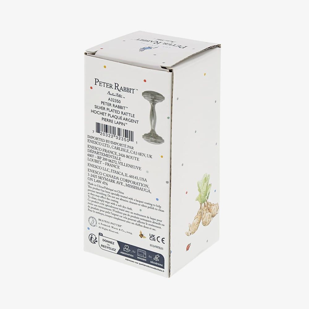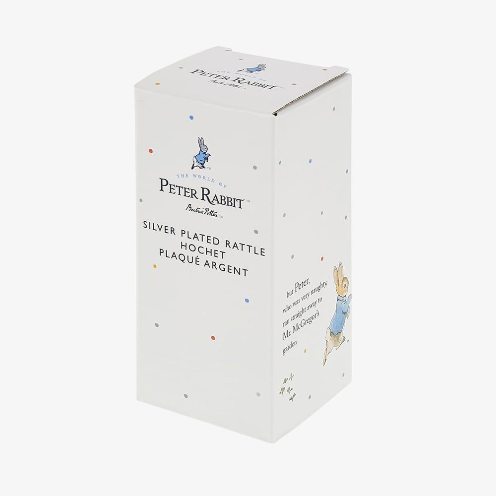 Welcome a new arrival with the Beatrix Potter New Baby Silver-Plated Baby Rattle. Featuring adorable etched Peter Rabbit designs on each end and engraved with the sweet message “Hop little rabbit”, this charming rattle is a timeless keepsake to be treasured for years. Presented in a branded Beatrix Potter gift box, it makes the perfect gift for new parents, baby showers, or Christenings.