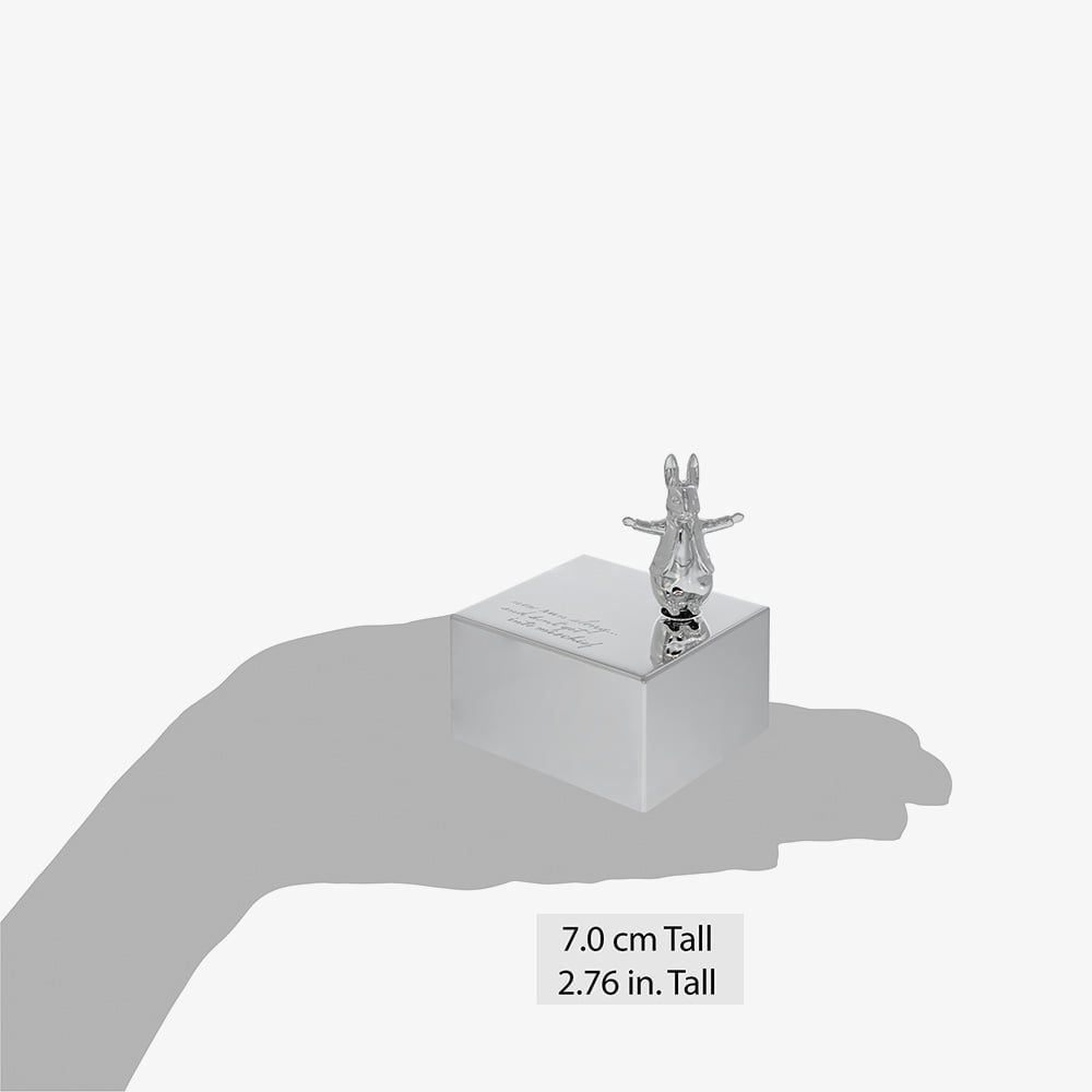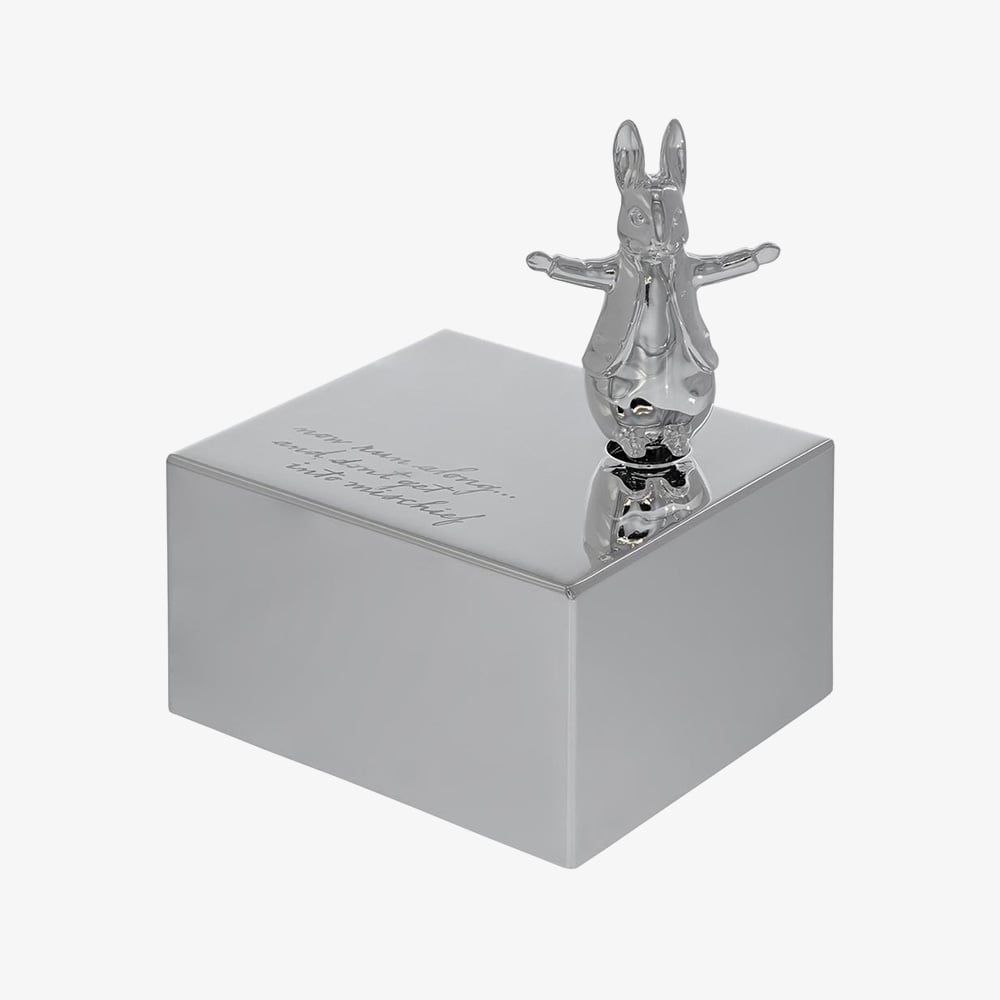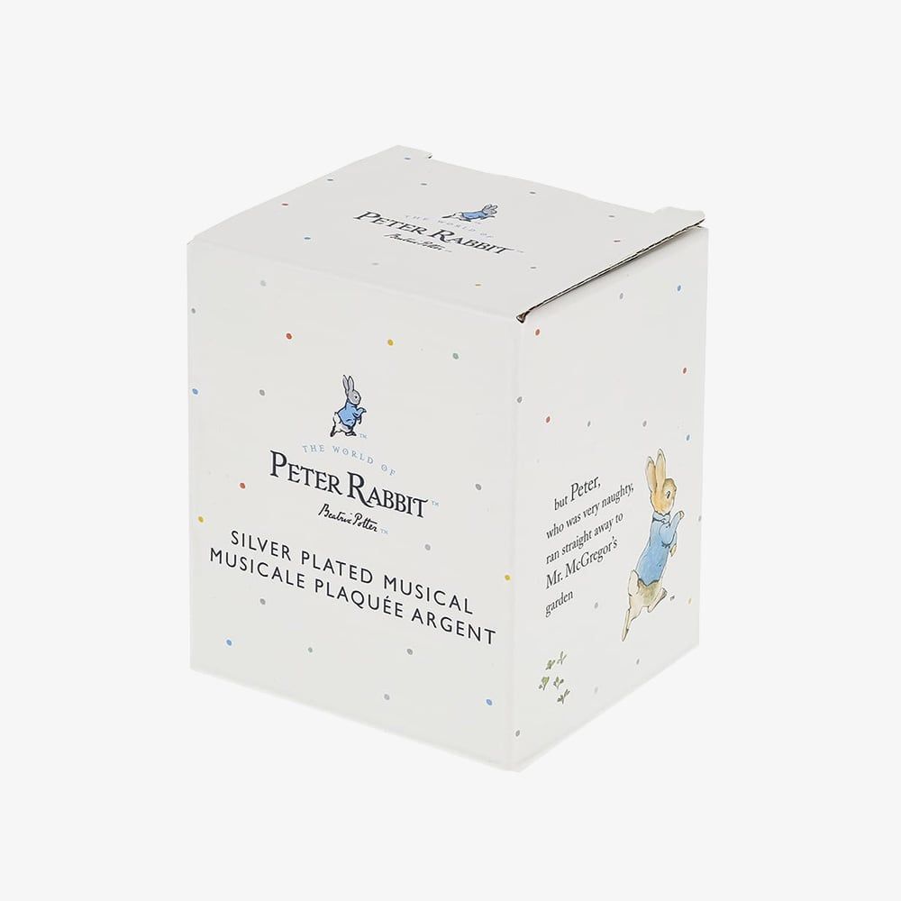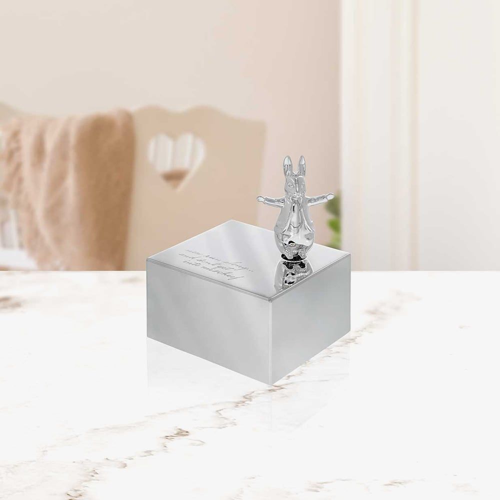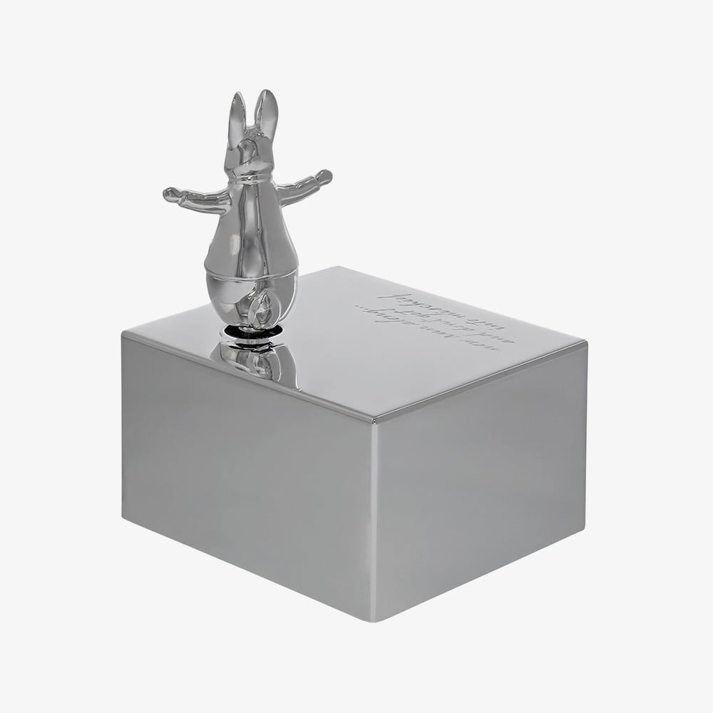 Delight new parents with the Peter Rabbit Silver-Plated Musical Box. Featuring a sculpted Peter Rabbit on top, this charming keepsake plays Brahms’ Lullaby as beloved Beatrix Potter characters twirl gracefully. Presented in a Beatrix Potter branded gift box, it makes a perfect gift for a new baby, baby shower, or Christening, combining adorable design with timeless music.
