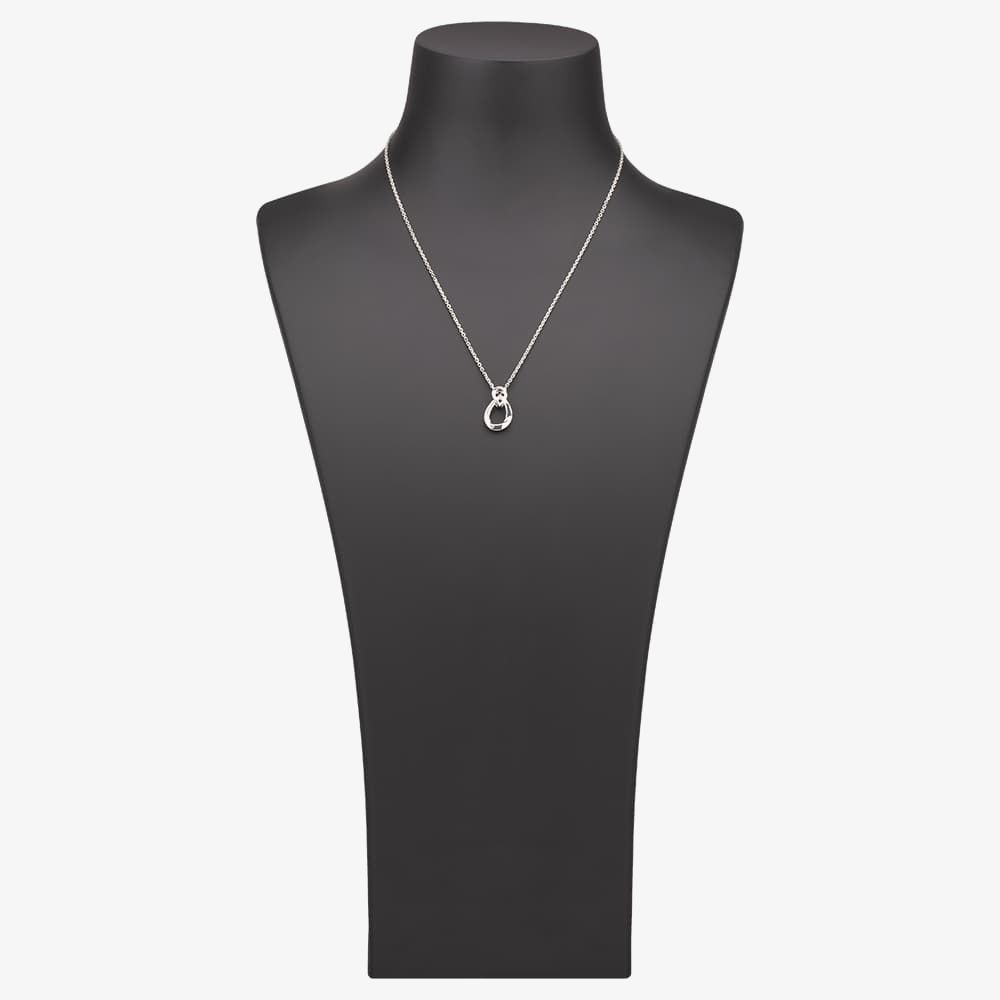 The Cradled Teardrop design combines a large elongated pear-shape with a much smaller inverted pear, entwining the two together so that the smaller is supporting the larger. An integrated bale is hidden in the curve of the upper teardrop, allowing free movement along the chain.