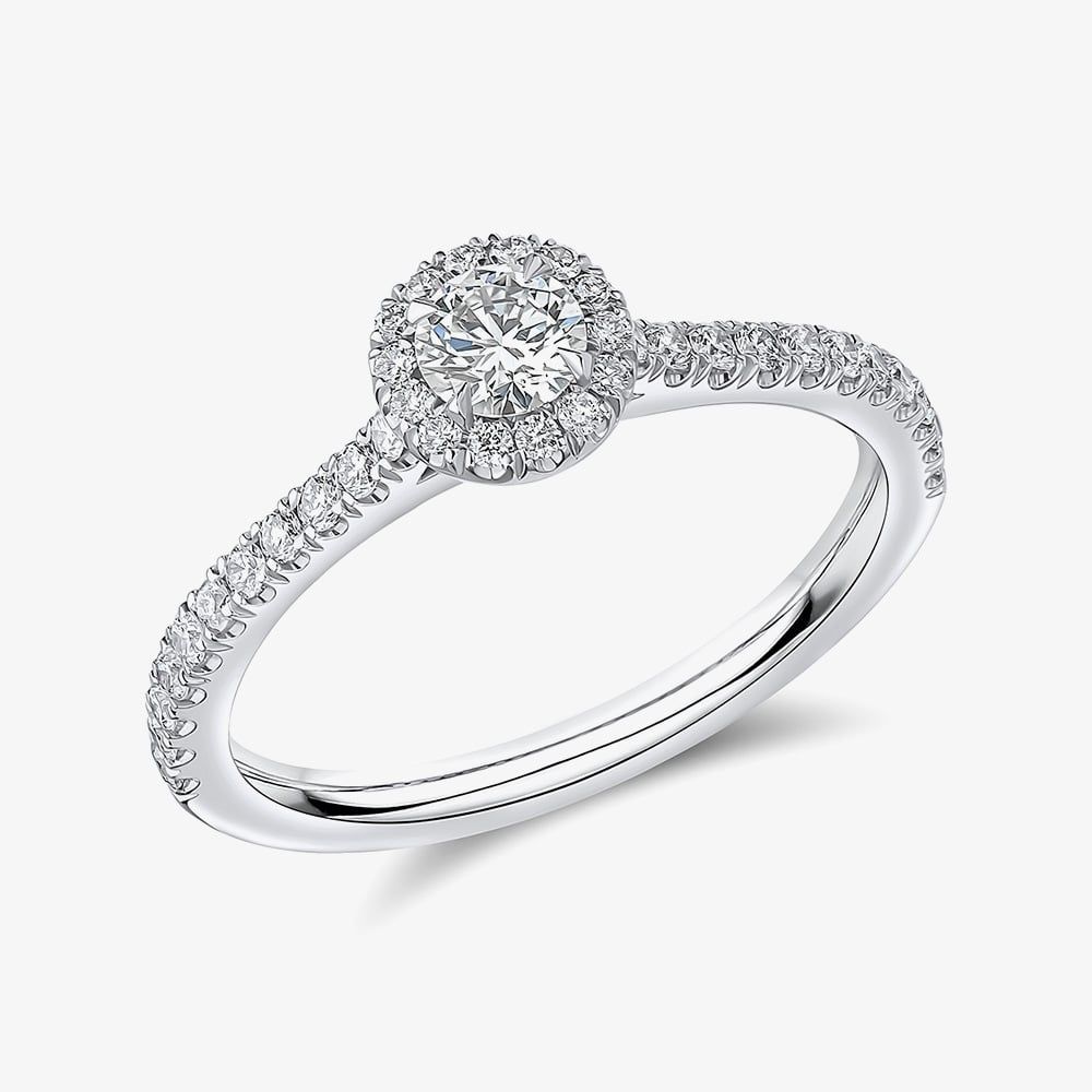 This exquisite platinum solitaire ring, features a 0.20ct brilliant-cut diamond as the centrepiece in a secure claw setting. Surrounding the main stone, a sparkling halo and set shoulders of brilliant-cut diamonds totalling 0.30ct, oyster-set for a seamless, luxurious finish, amplifies its brilliance. Perfect for engagements, anniversaries, or as a sophisticated gift, this platinum diamond ring combines classic elegance with modern glamour.
