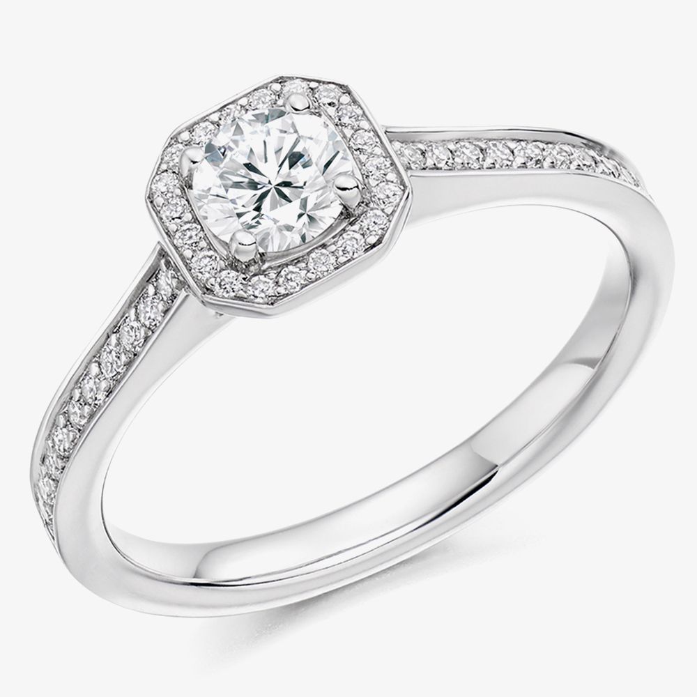 Making a truly sparkly statement, the Platinum 0.53ct Diamond Shoulder-Set Halo Engagement Ring is a must-have. Made from platinum, this stunning square halo ring has a 4.3mm ring shank and features a 0.33ct brilliant cut centre diamond in a claw setting framed beautifully by 0.20ct of grain set halo and shoulder diamonds.