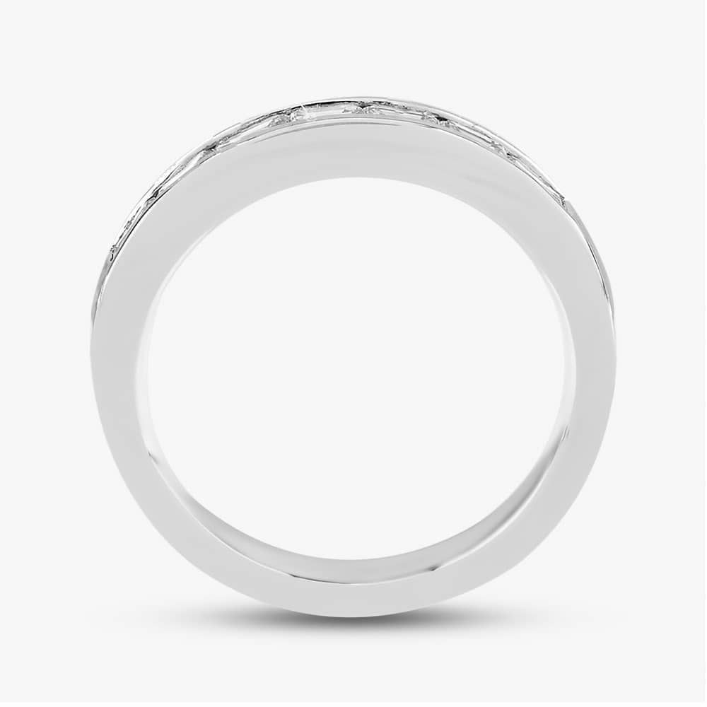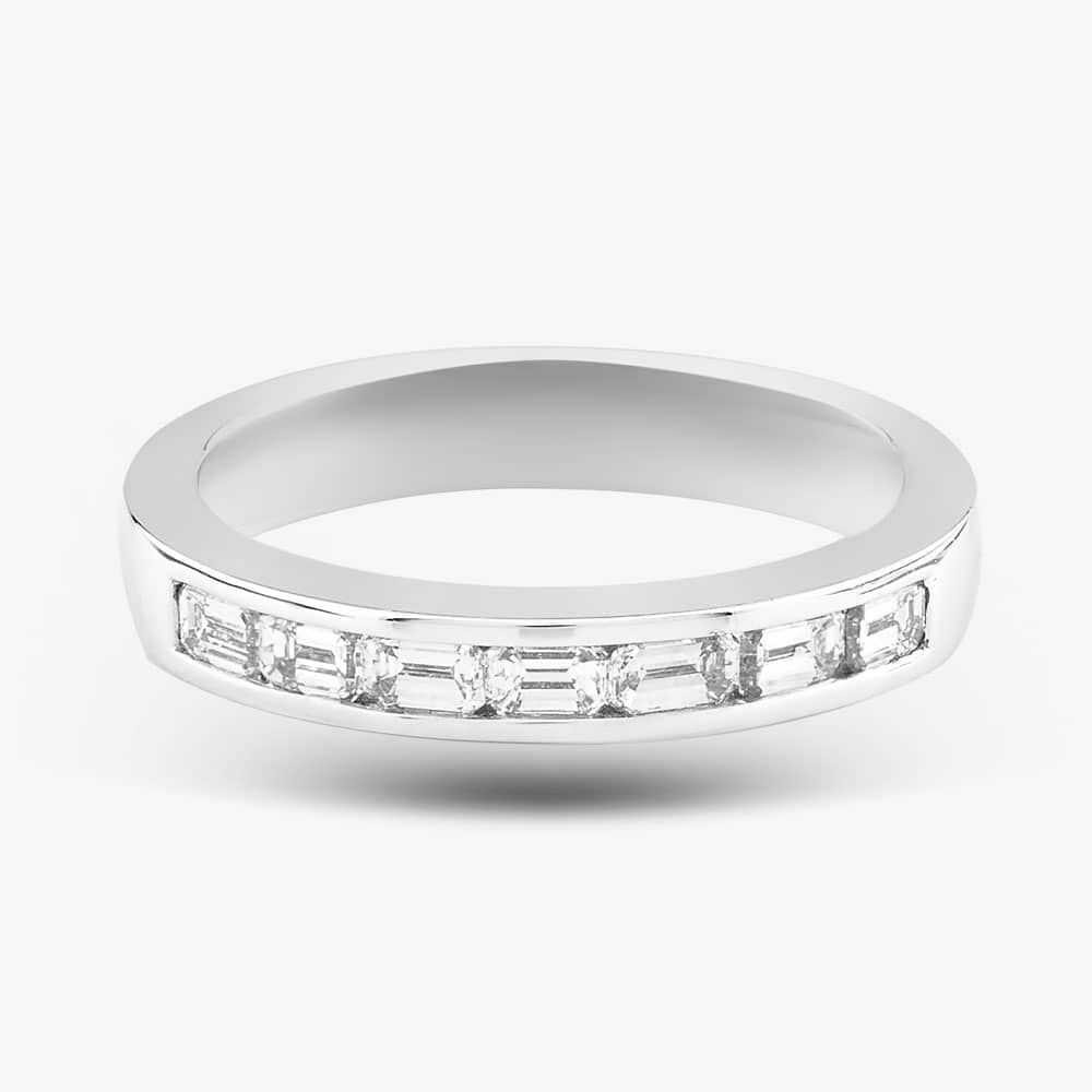 Crafted with a touch of simplicity, this half-eternity ring exudes timeless elegance. Delicate platinum embraces 0.60ct of emerald-cut white diamonds, nestled securely in a classic four-claw setting. The perfect accompaniment for any special occasion, this ring promises to leave a lasting impression.