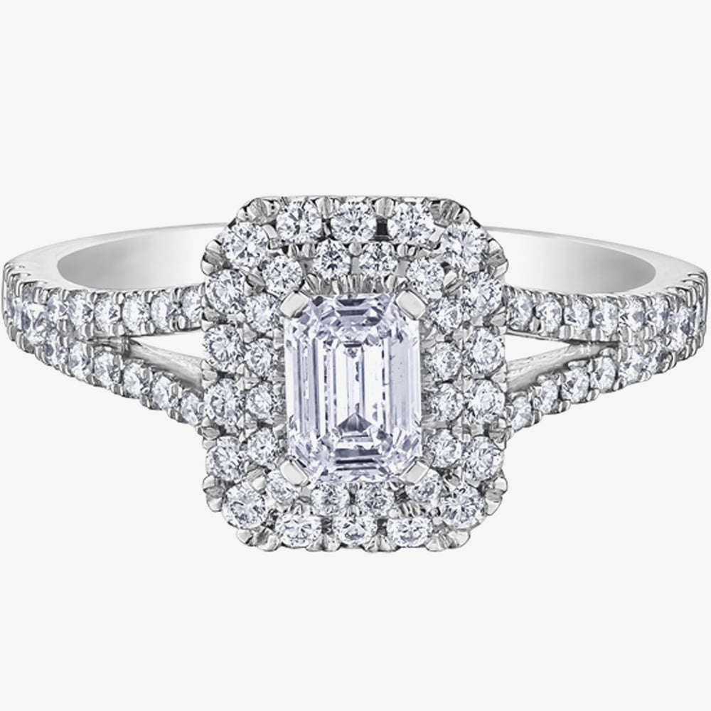 This striking cluster ring has been crafted in platinum & features a sparkling emerald cut 0.50ct centre diamond with a secure claw setting with a two-row pave set halo round diamond surround & is finished with a pave set glistening split shoulders design. The diamonds on this cluster ring really sparkle & catch the light beautifully making this the perfect statement piece to add to your collection. The diamond total carat weight for this ring is 1.04ct.